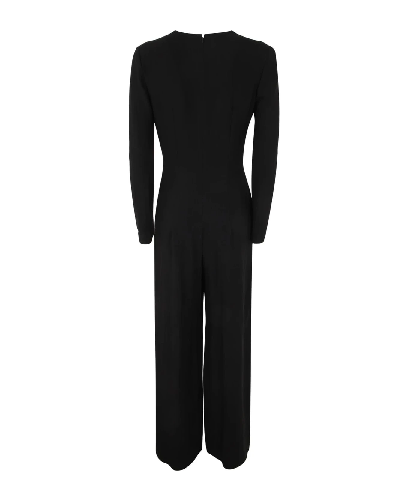 Black Enver draped satin jumpsuit, bow detailing, V-neck, concealed rear zip fastening, long sleeves, wide leg