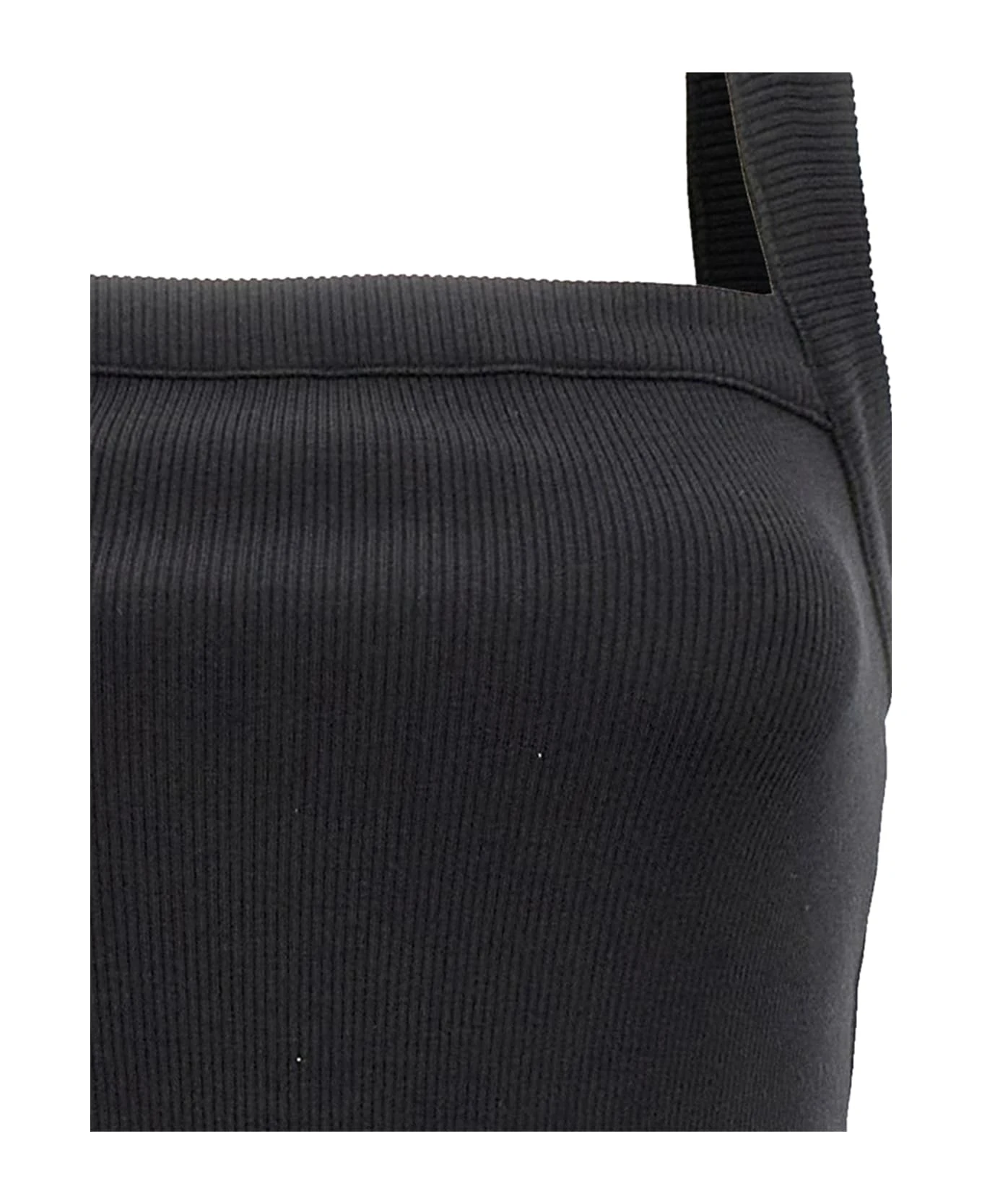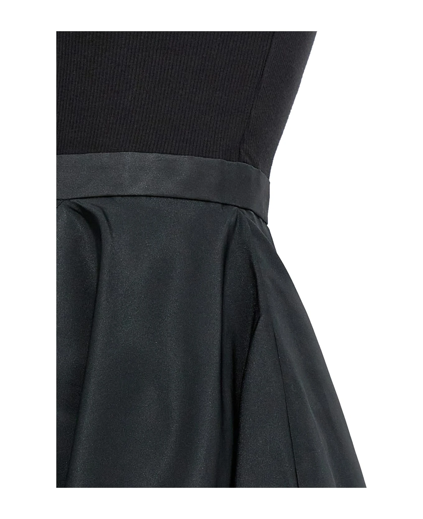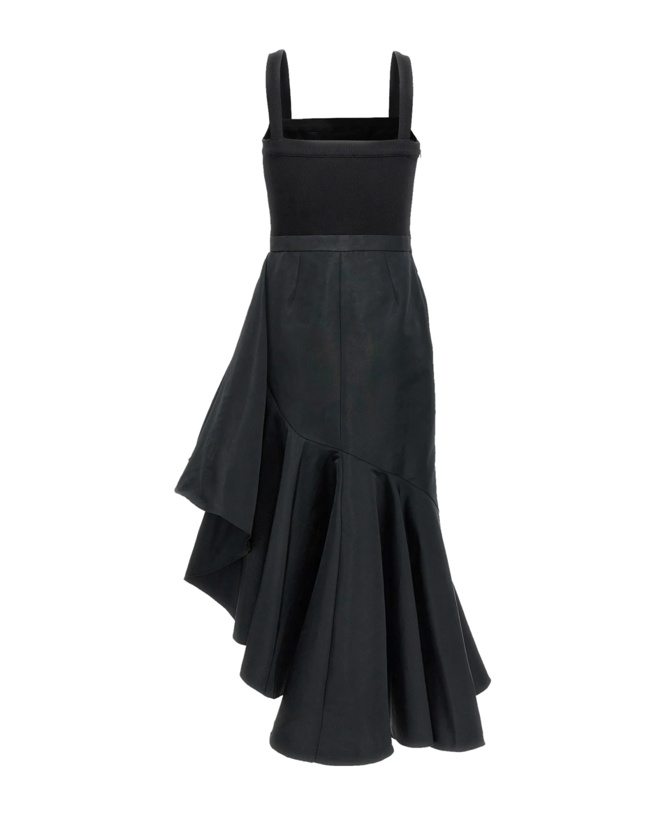 Dress with ribbed cotton top, square neckline and shoulder straps, ruffle skirt and asymmetric hem, side zip closure.