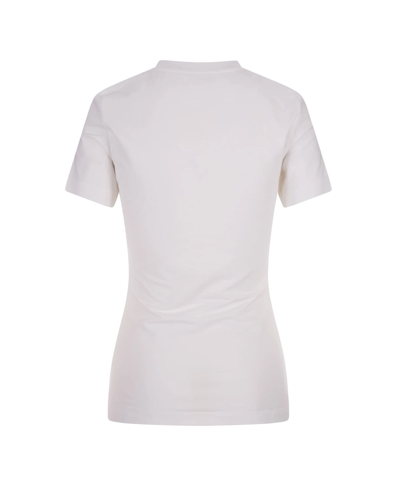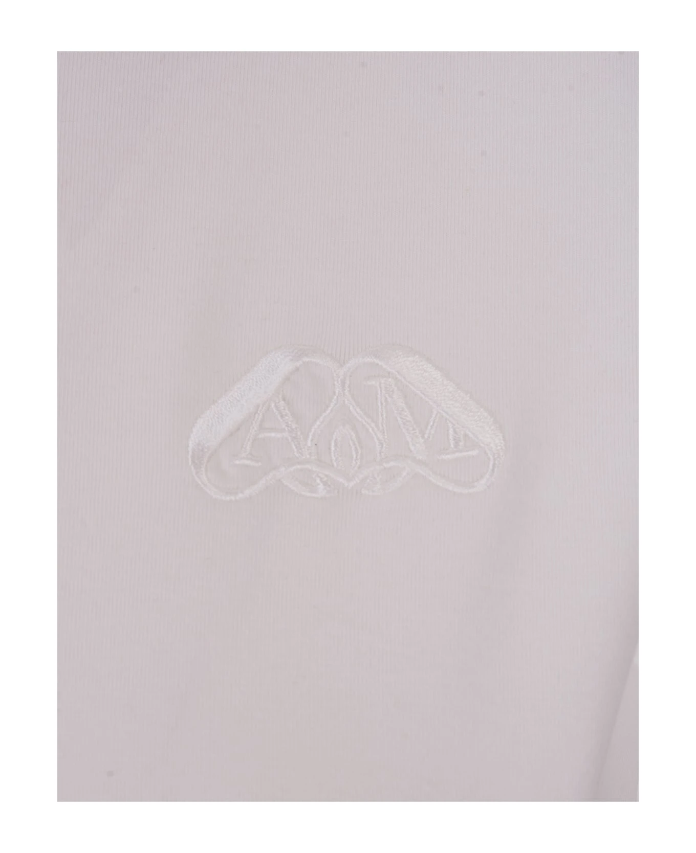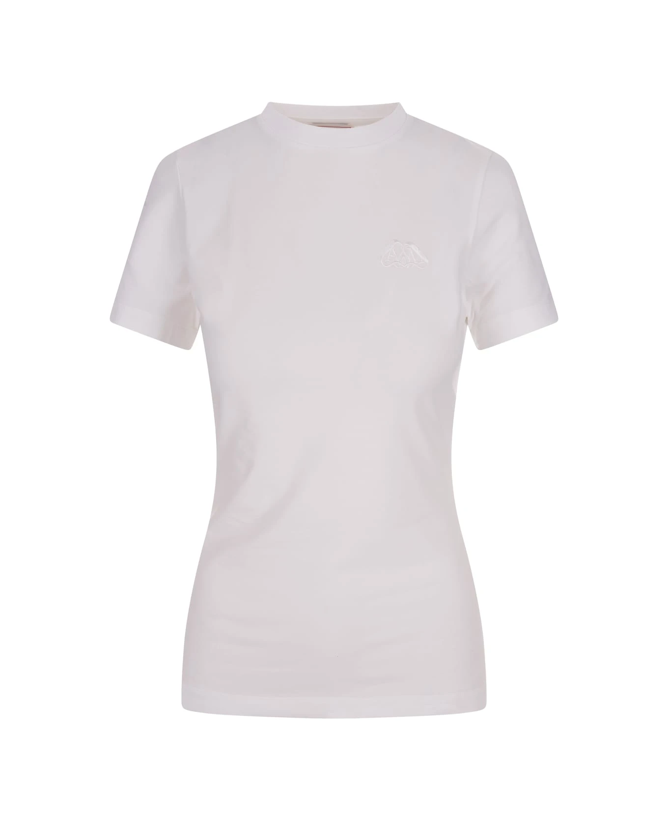 Slim-fit t-shirt by Alexander McQueen made of optic white stretch cotton jersey with ribbed crew neck, short sleeves and tone-on-tone Seal logo embroidered on the chest.