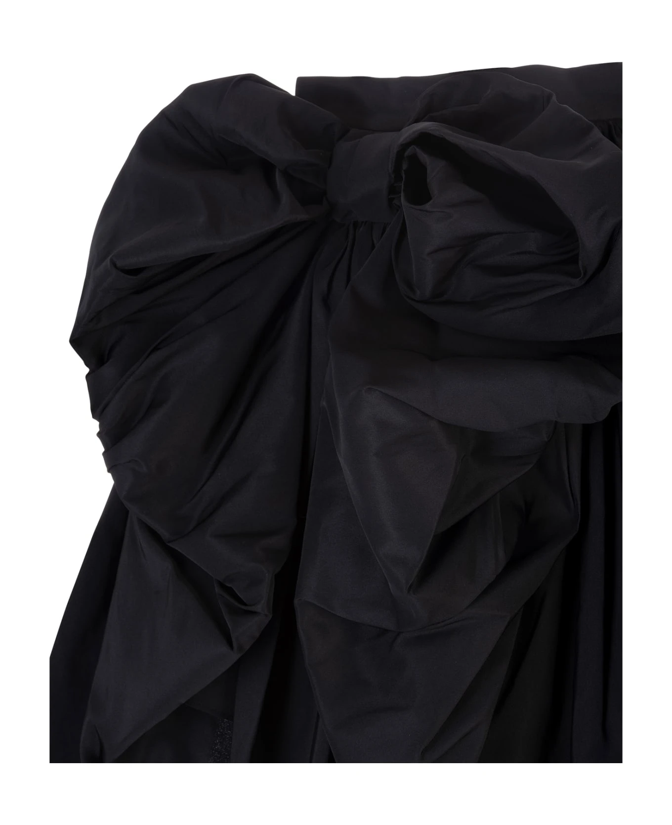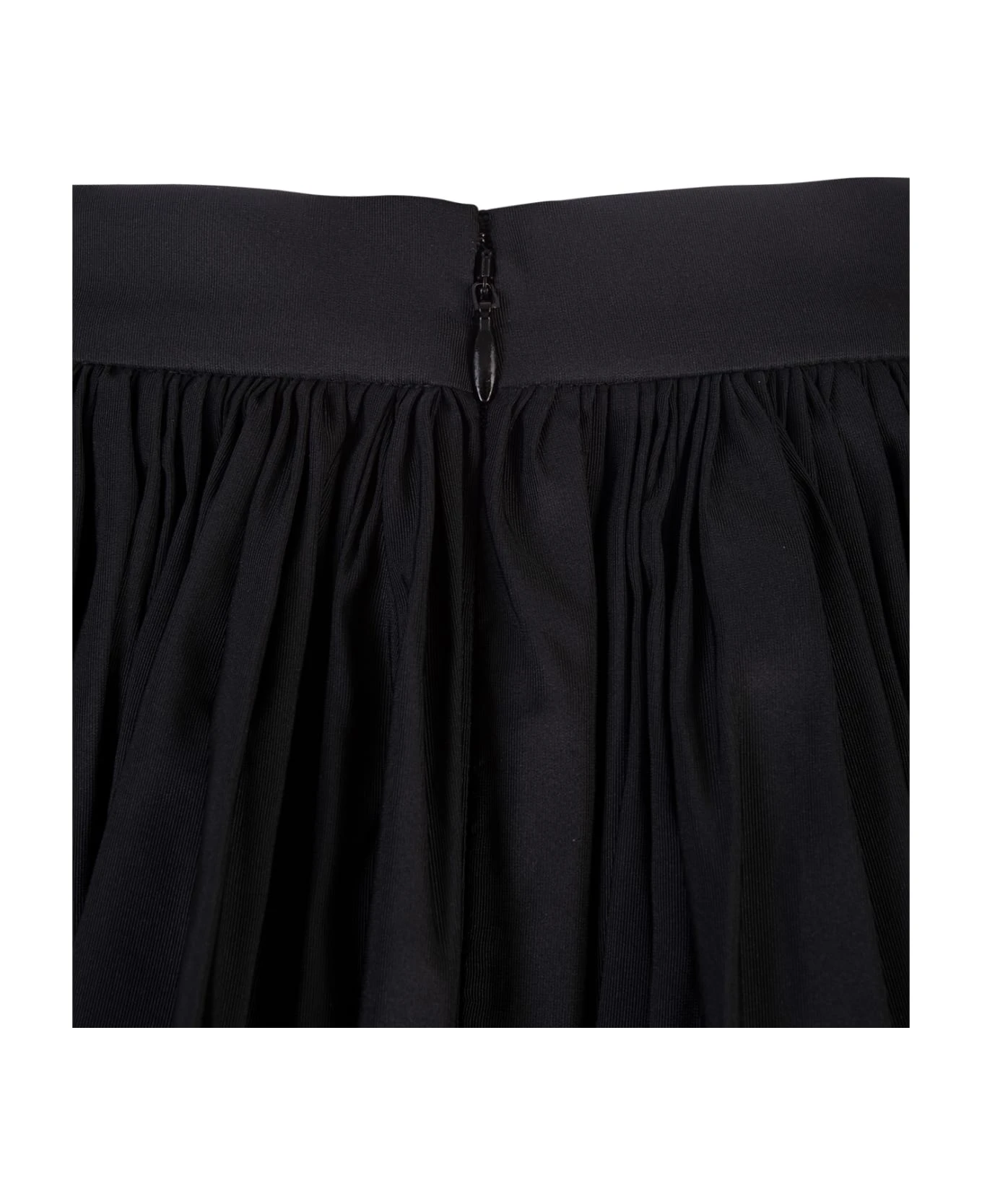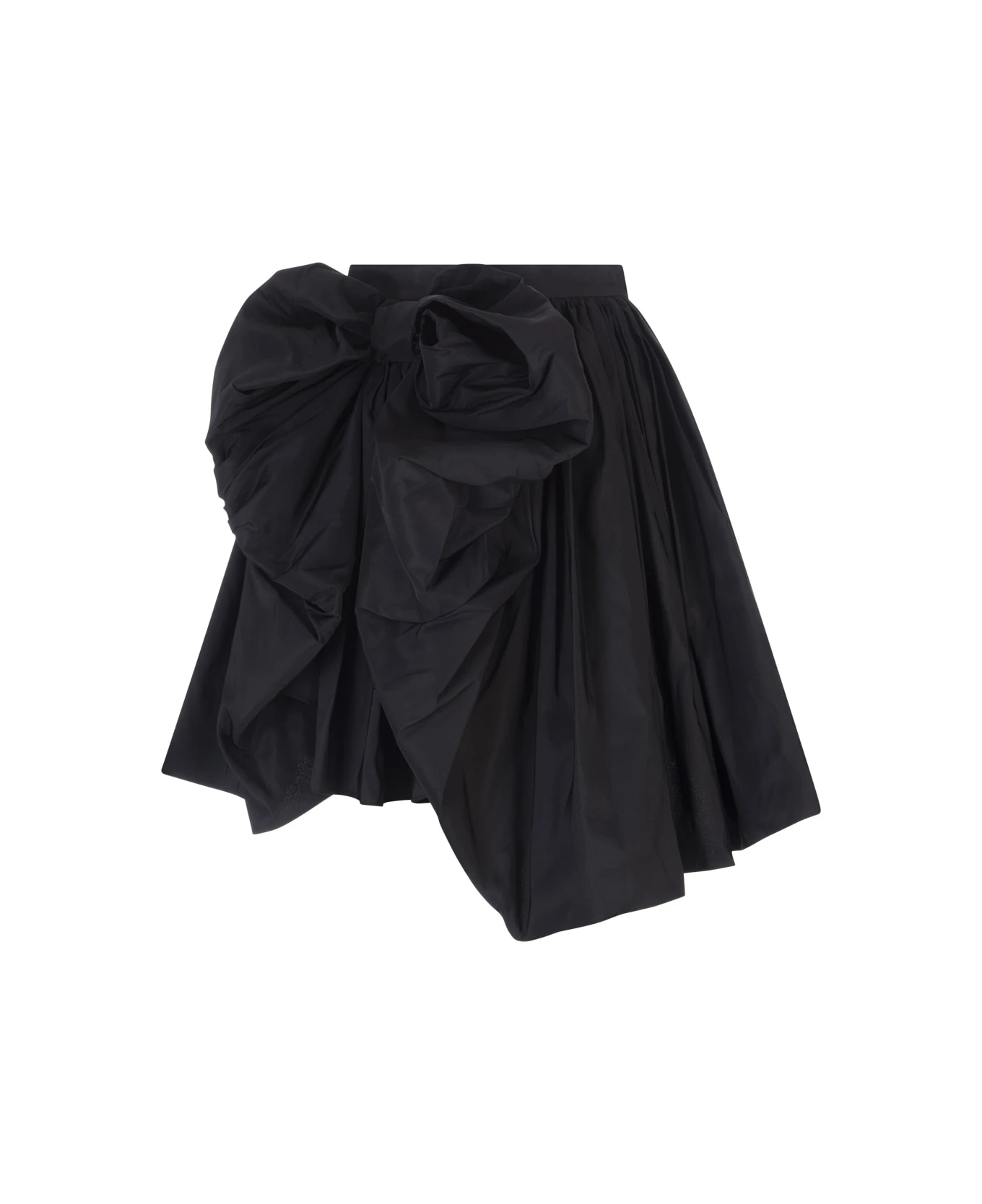 Short skirt by Alexander McQueen made of black polyfaille and characterised by high waist, flared design, asymmetrical bottom and front bow detail.