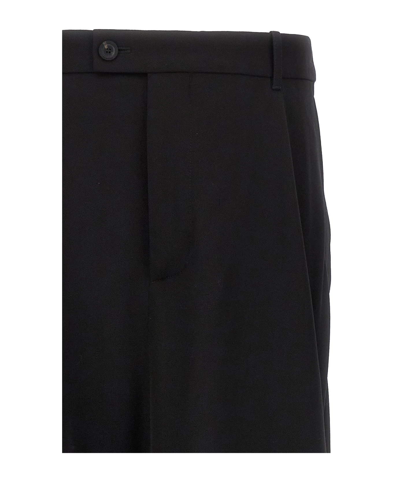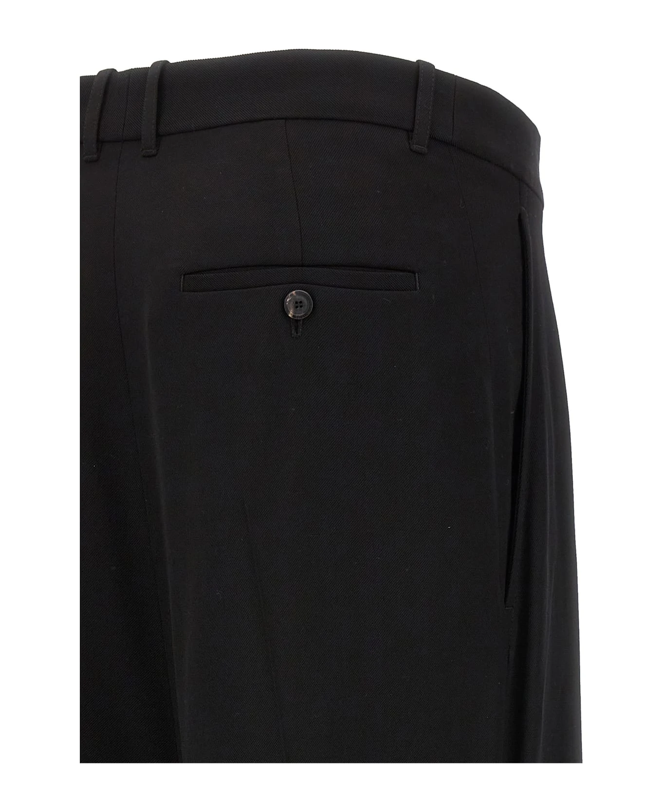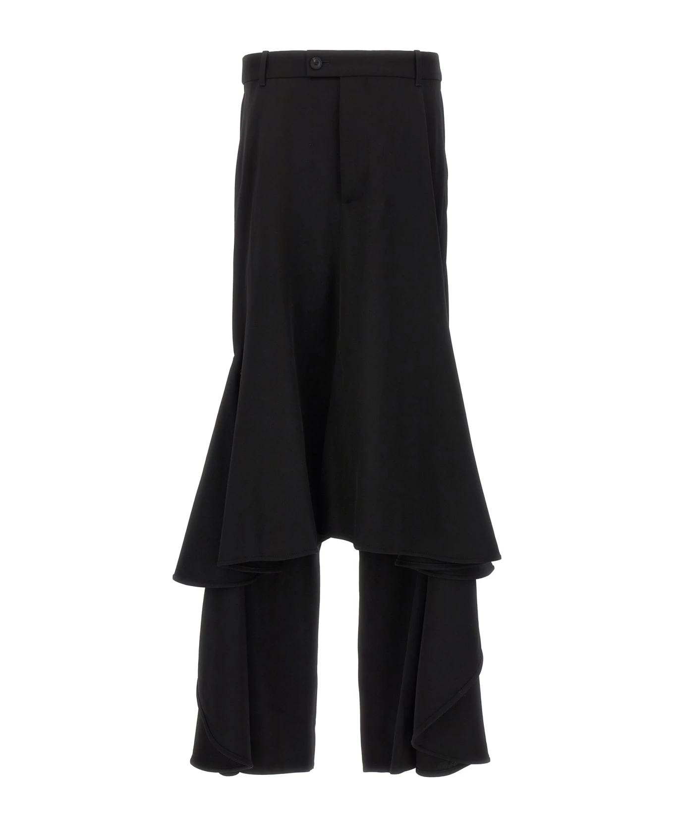‘Deconstructed Godet’ wool blend skirt with zip and button closure, and asymmetric hem.