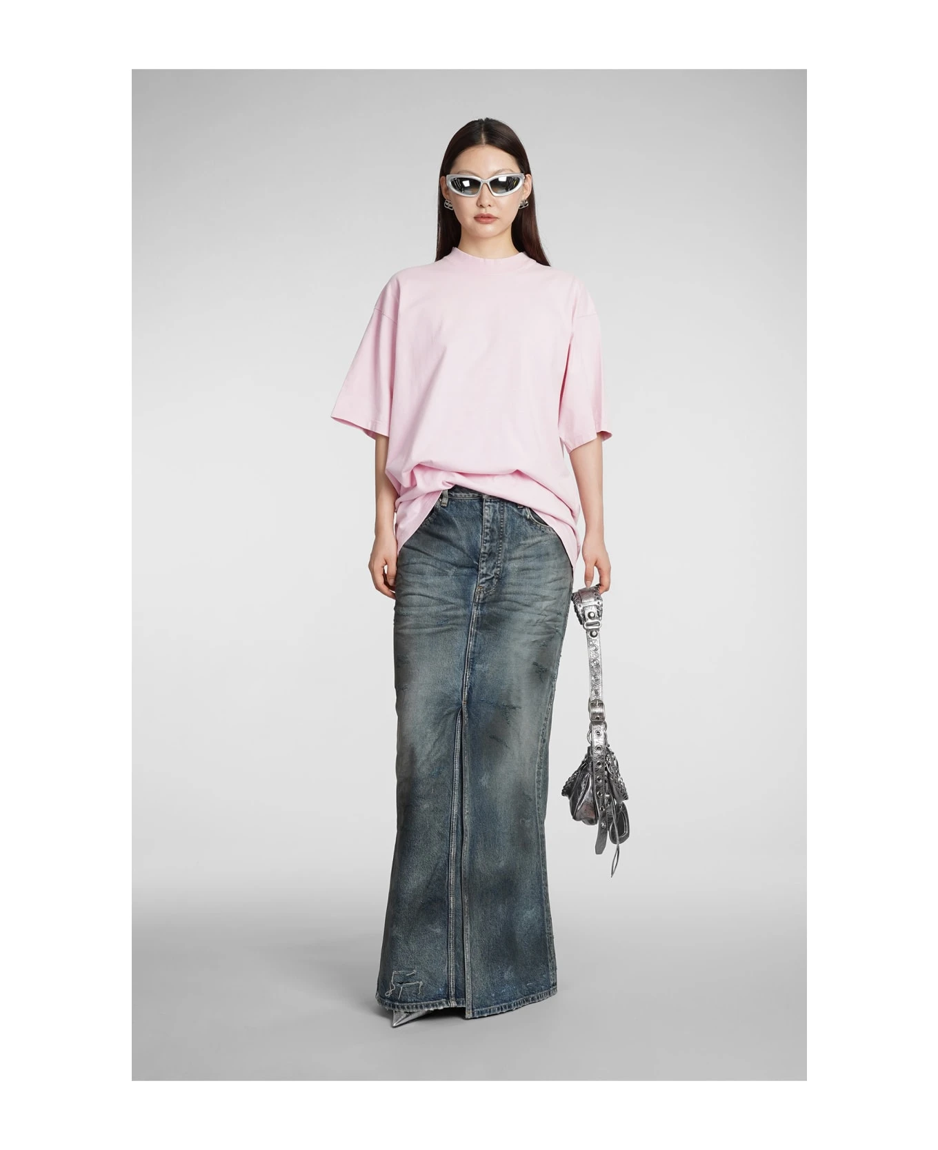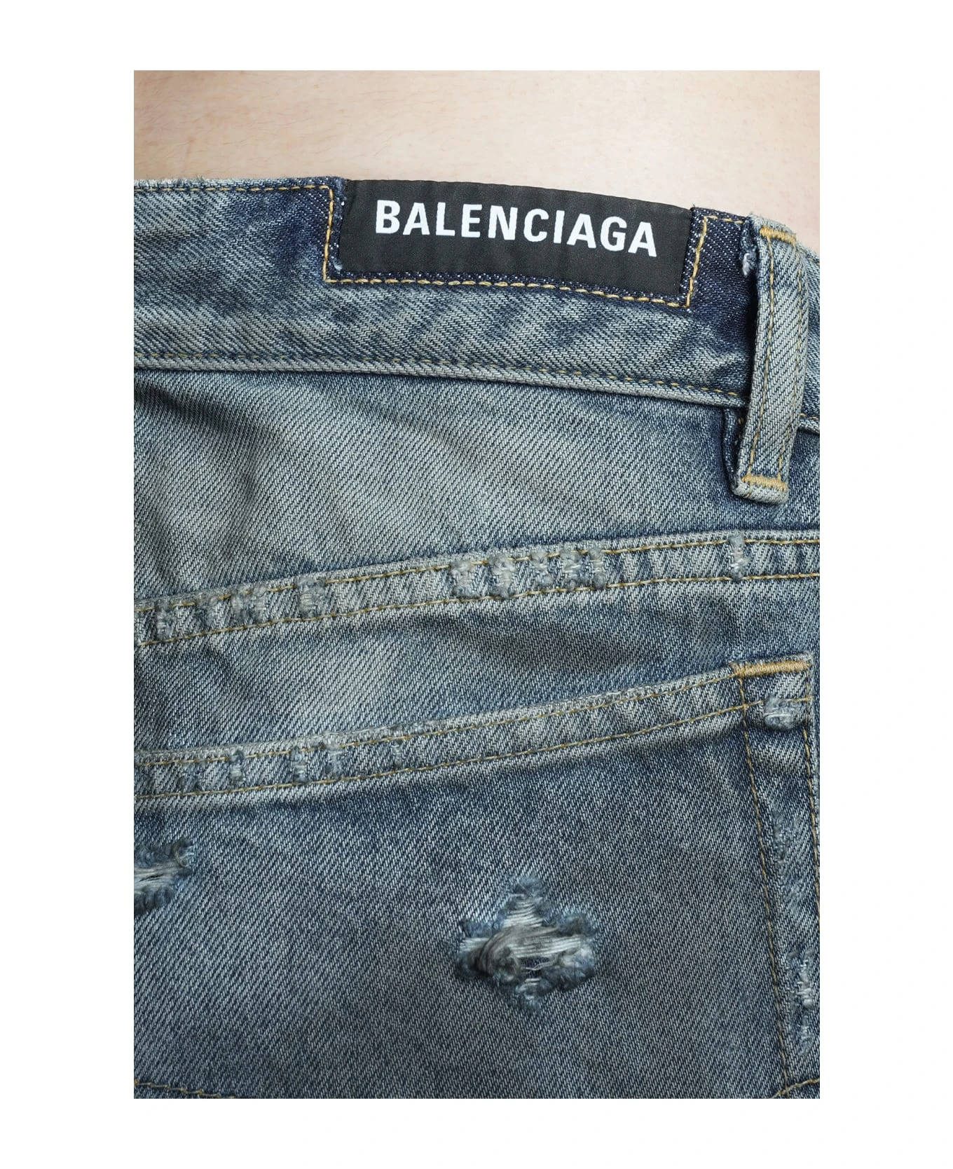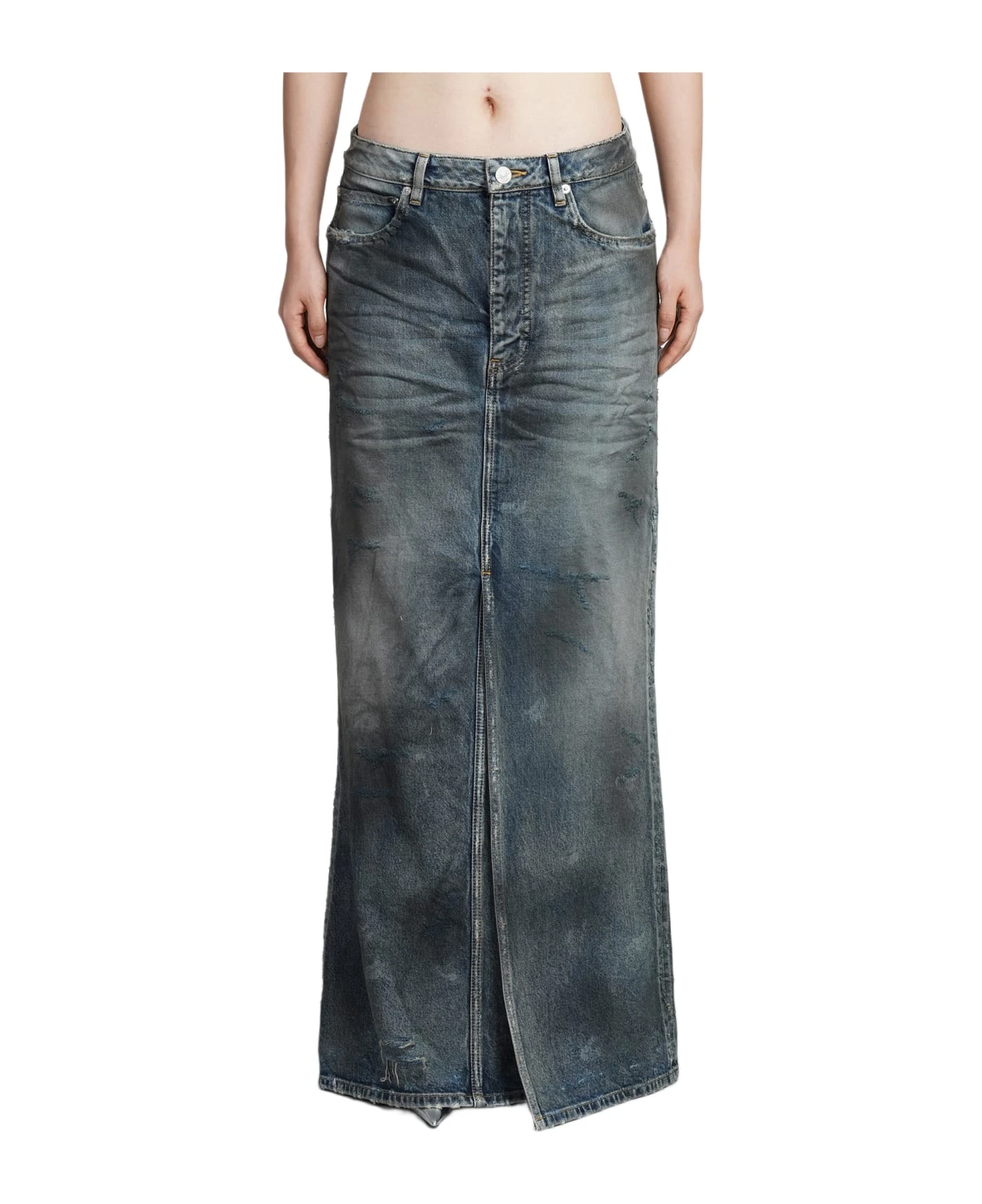 Skirt in blue cotton, button and zip closure, front slit, five pockets, waist belt loops, destroyed detail, Made in Japan, 100% cotton, model is 180 cm and wears size 40