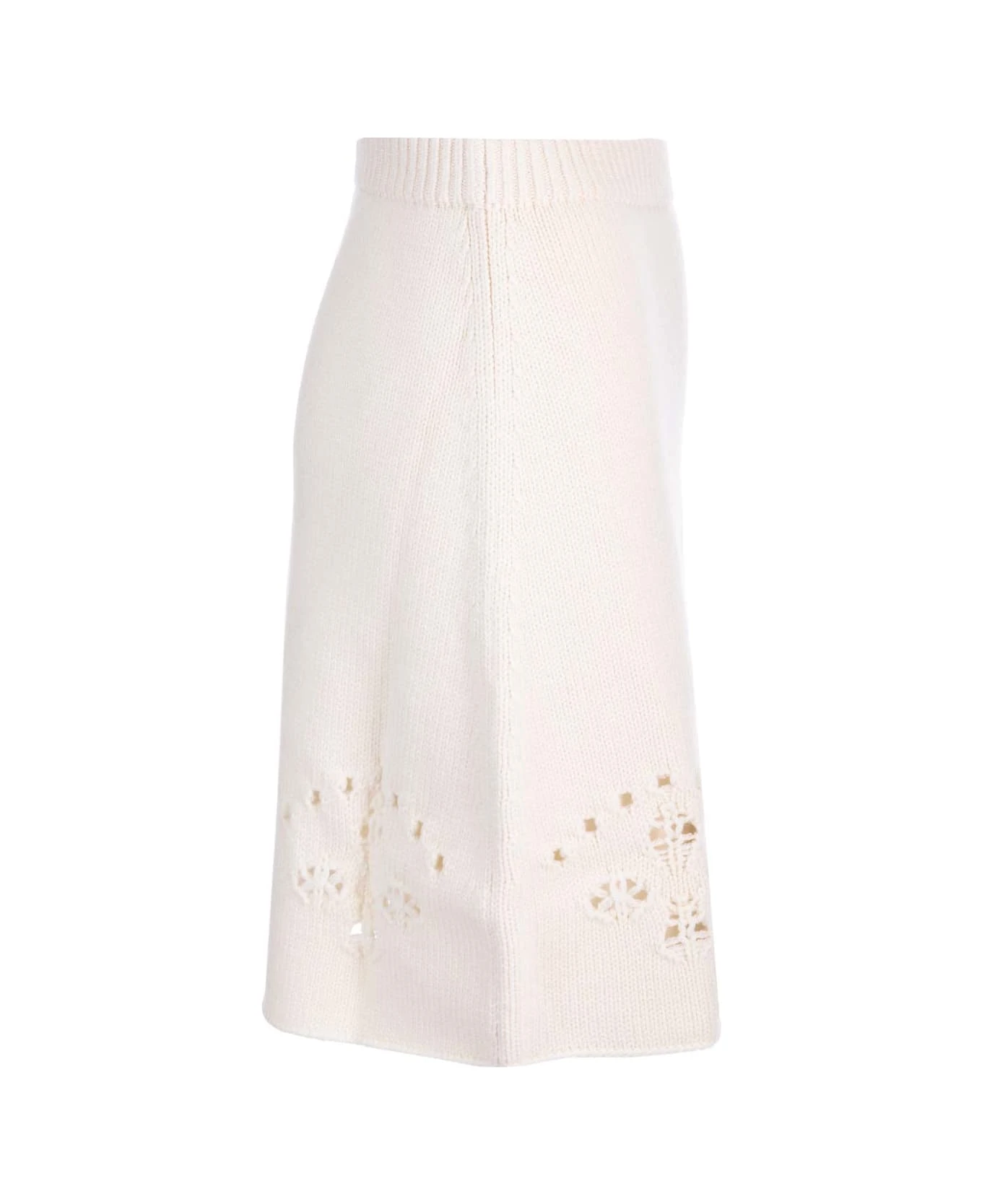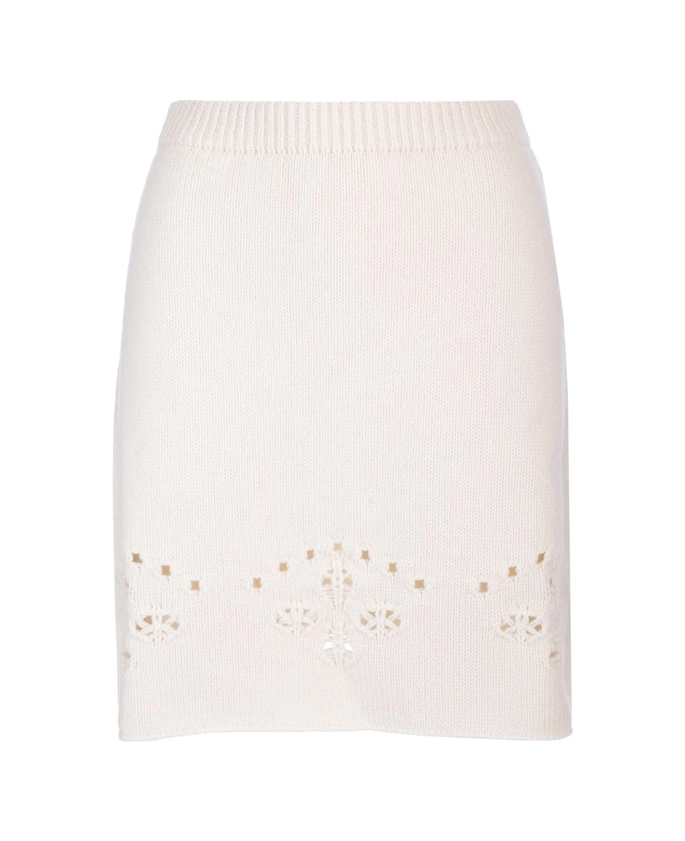 Ivory A-line miniskirt from Chloè in wool, perforated with motifs that recall the iconic wavy details and floral broderie anglaise lace of the Maison, elasticated waist.