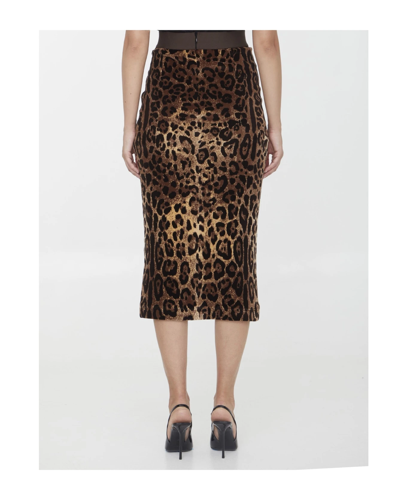 Cotton blend pencil skirt with all-over leopard-print. Stretch waistband with Dolce & Gabbana logo and rear zip closure. Tight fit.
