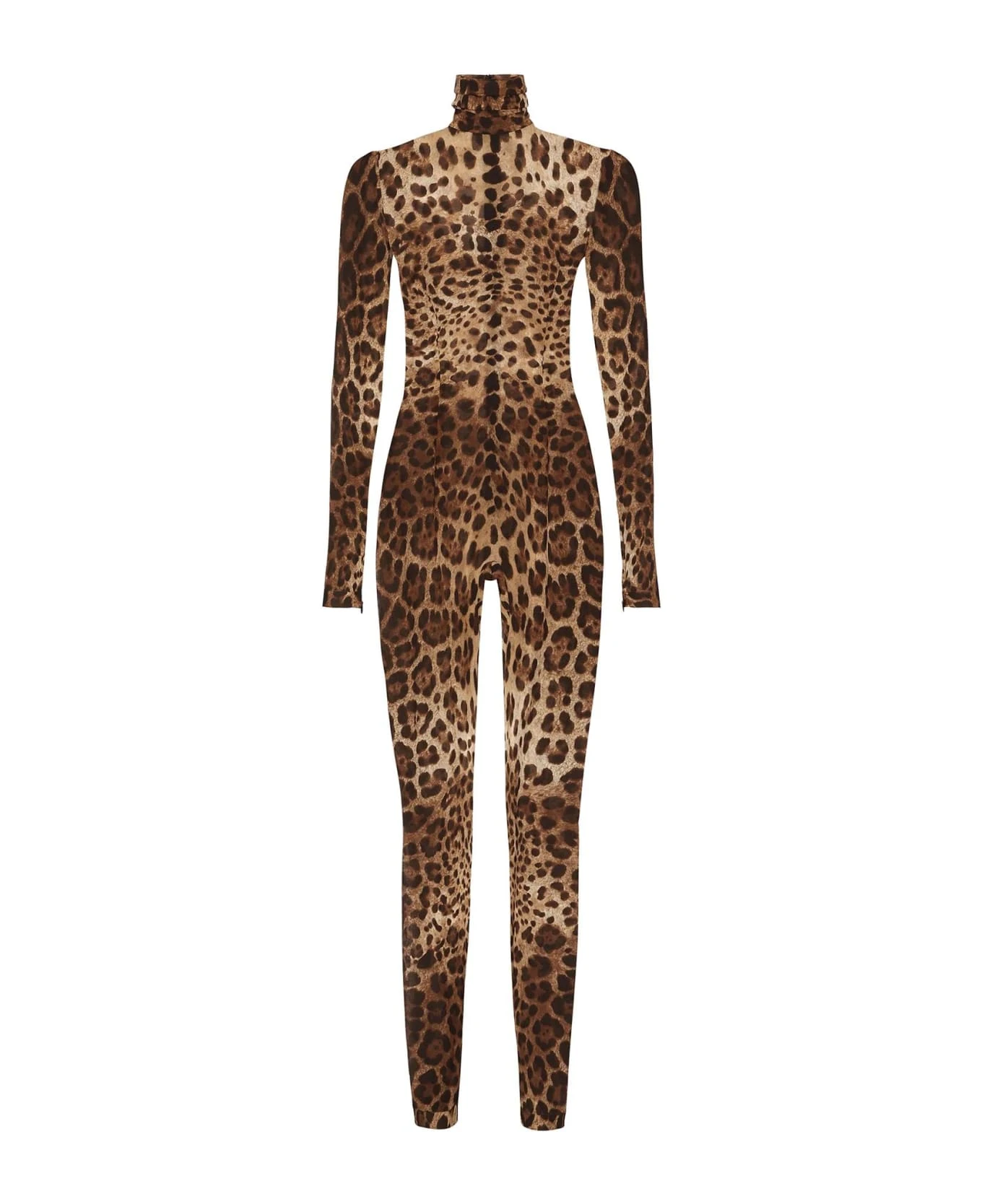Dolce & Gabbana long-sleeved turtleneck jumpsuit made of semi-sheer leopard-printed silk chiffon. Shaped to a fitted silhouette, it closes with invisible zippers at the back, cuffs and ankles. Re-Edition label stitched on the cuff. The model is 177 cm tall and wears a size IT 40.