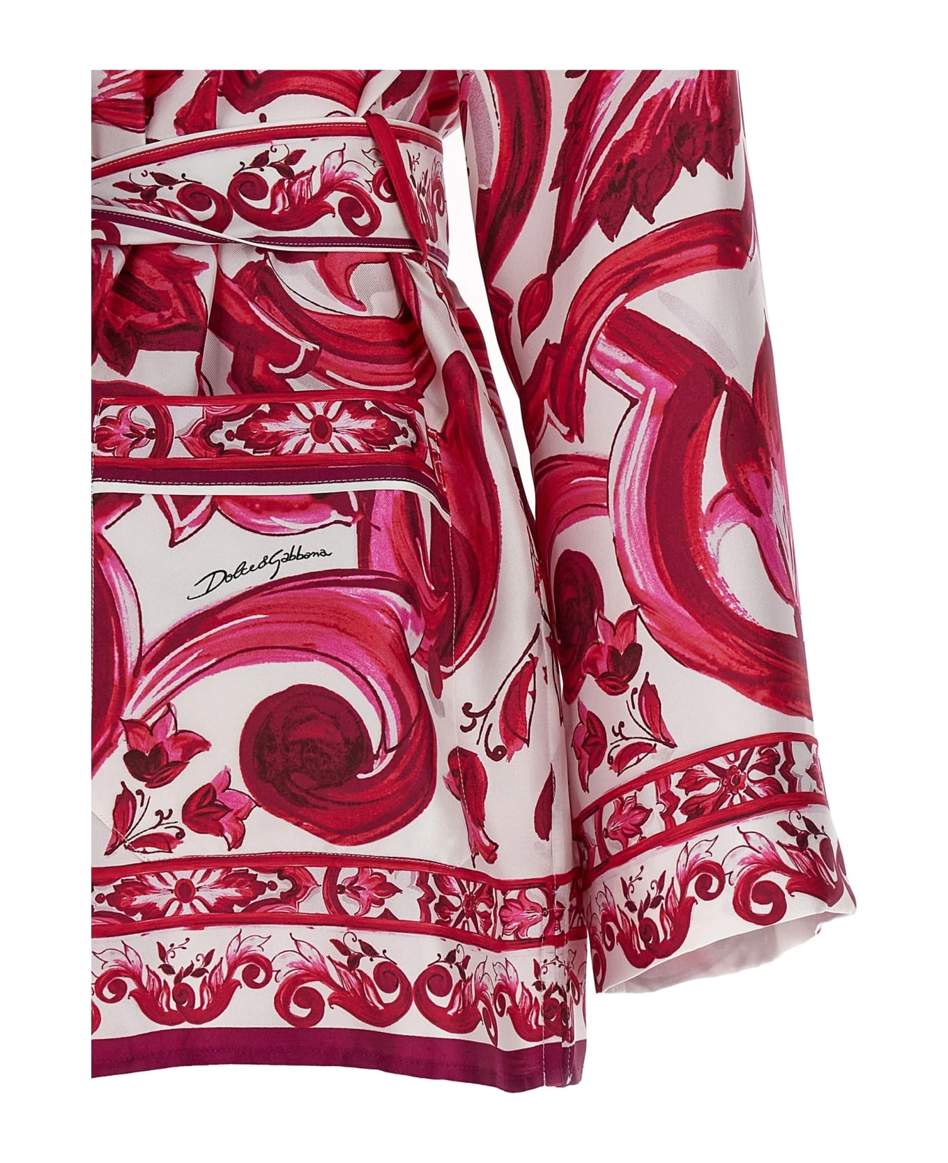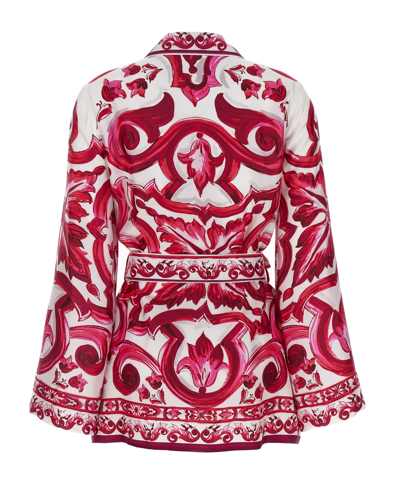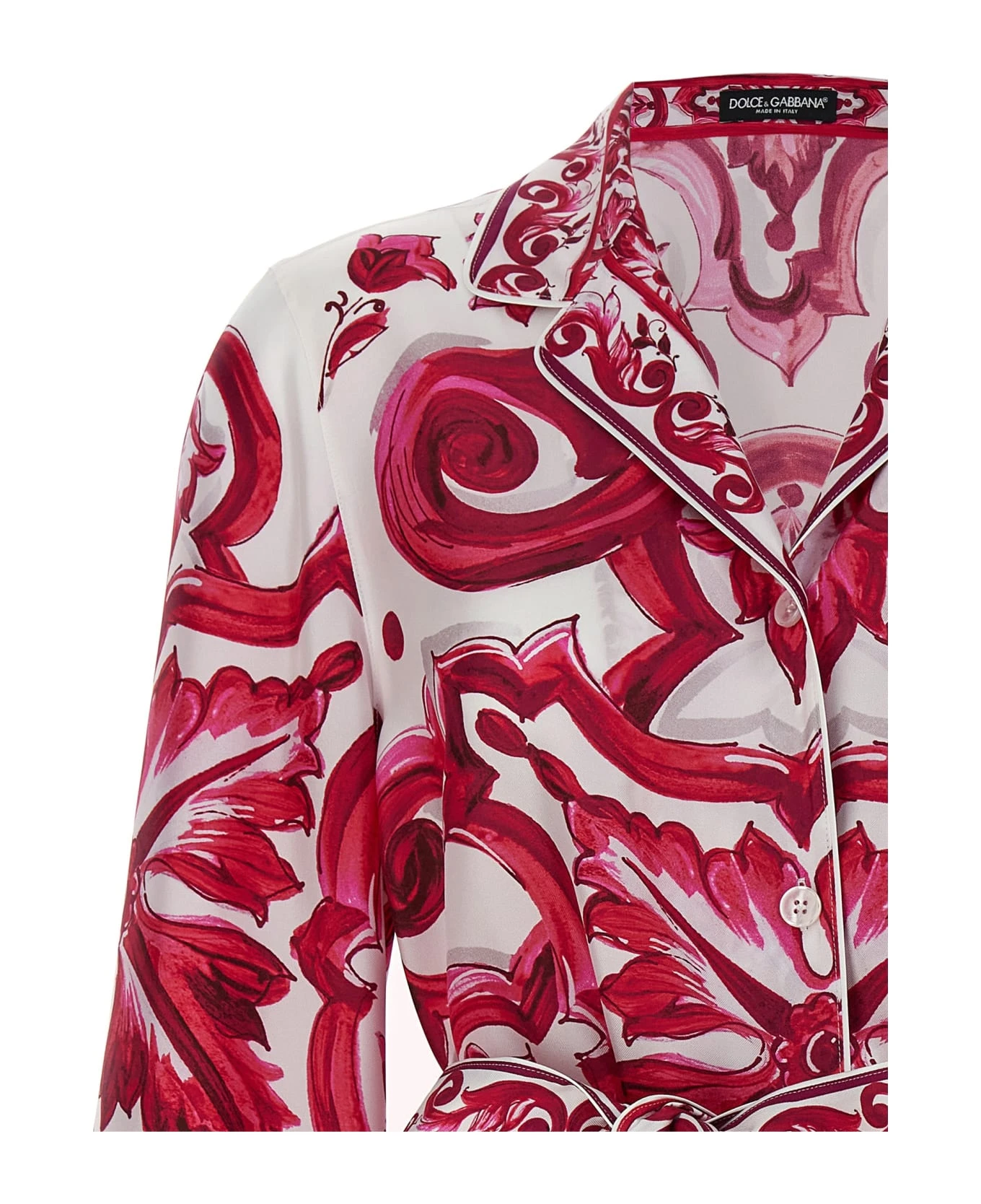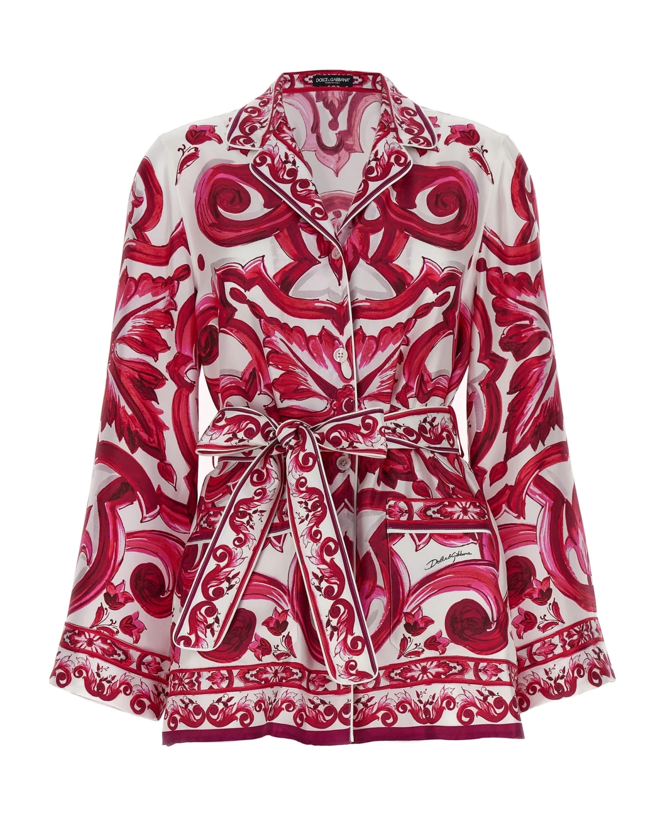 Silk shirt with all-over maiolica print, button closure, long sleeve with turned-up cuffs, pockets, and waist belt.