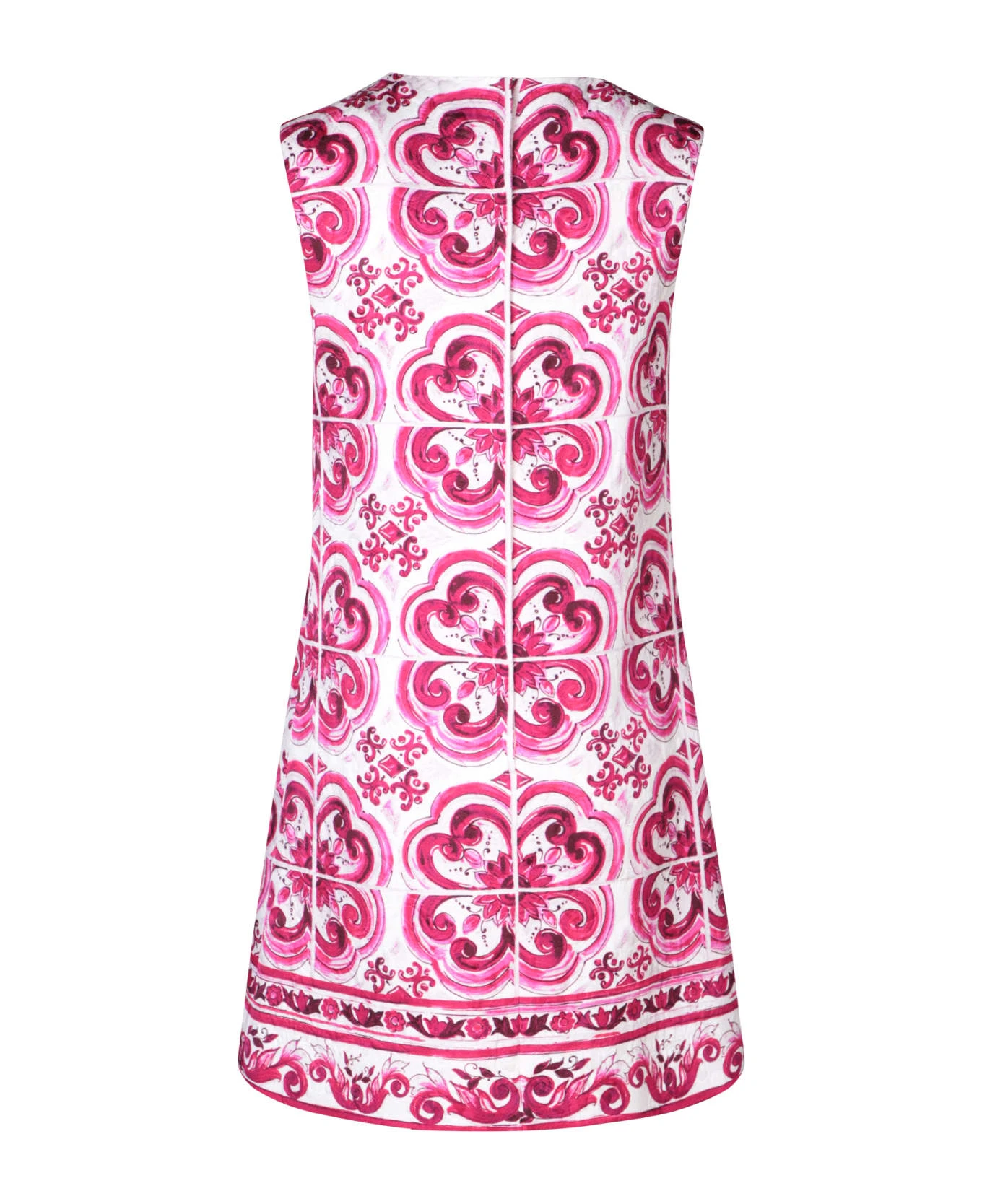 Roundneck. Sleeveless. Rear zip fastening. Flared. All-over majolica print. Above knee length. Loose fit. Straight hem. Color: fuxia/ white