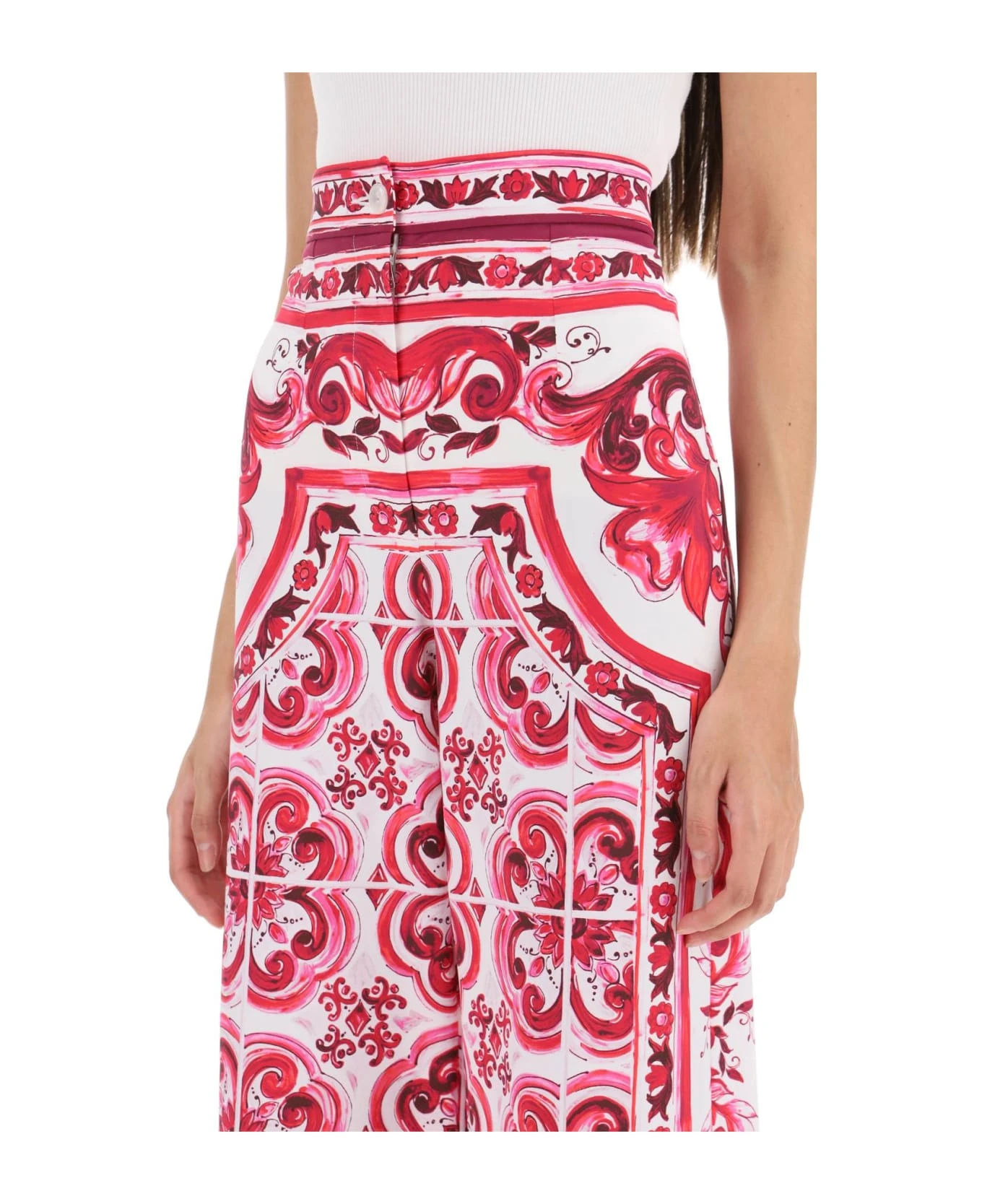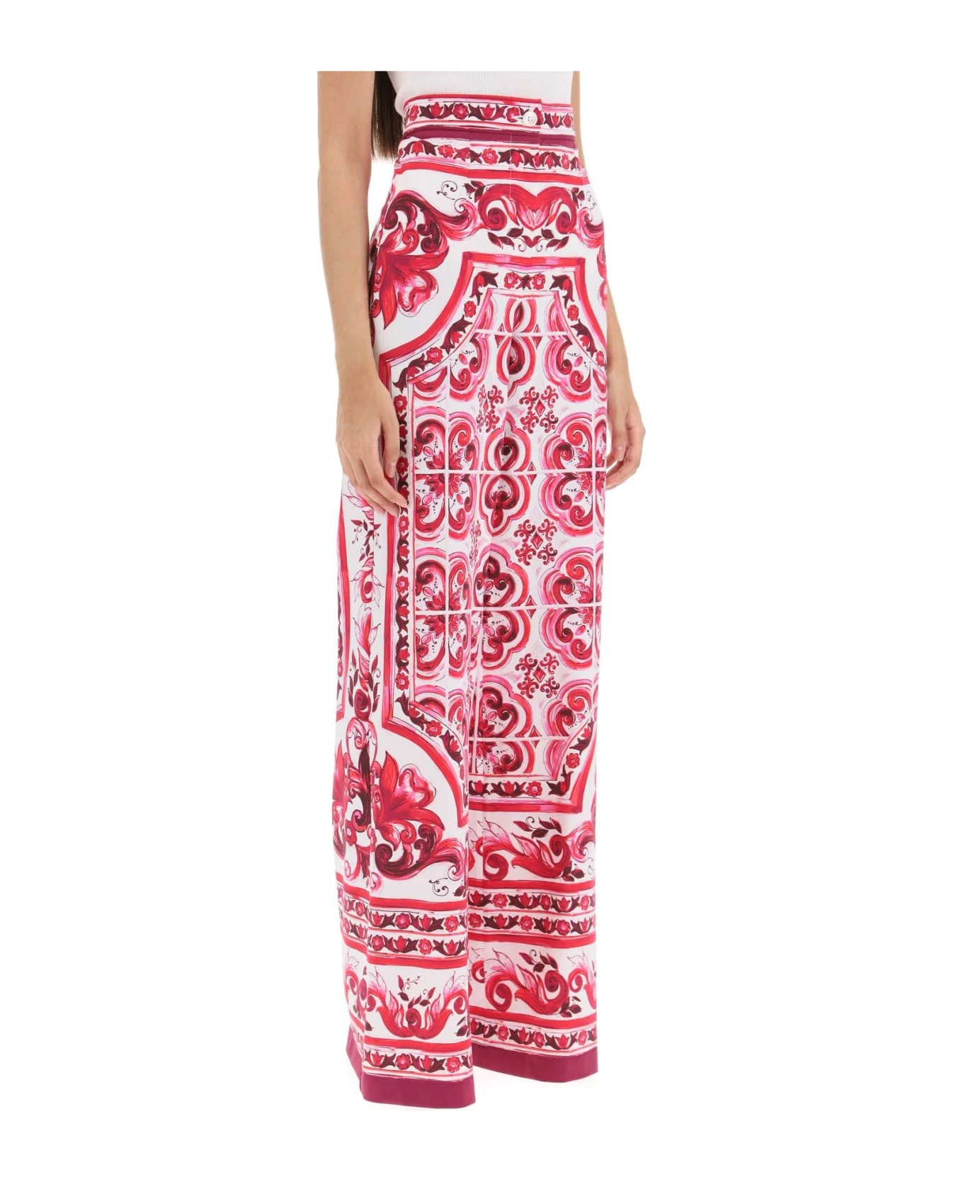 Dolce&Gabbana palazzo pants crafted in technical jersey with Maiolica motif all-over. Design with Dolce high-rise waist featuring front fastening with zipper fly and button. Regular fit with wide leg. The model is 177 cm tall and wears size IT 40.