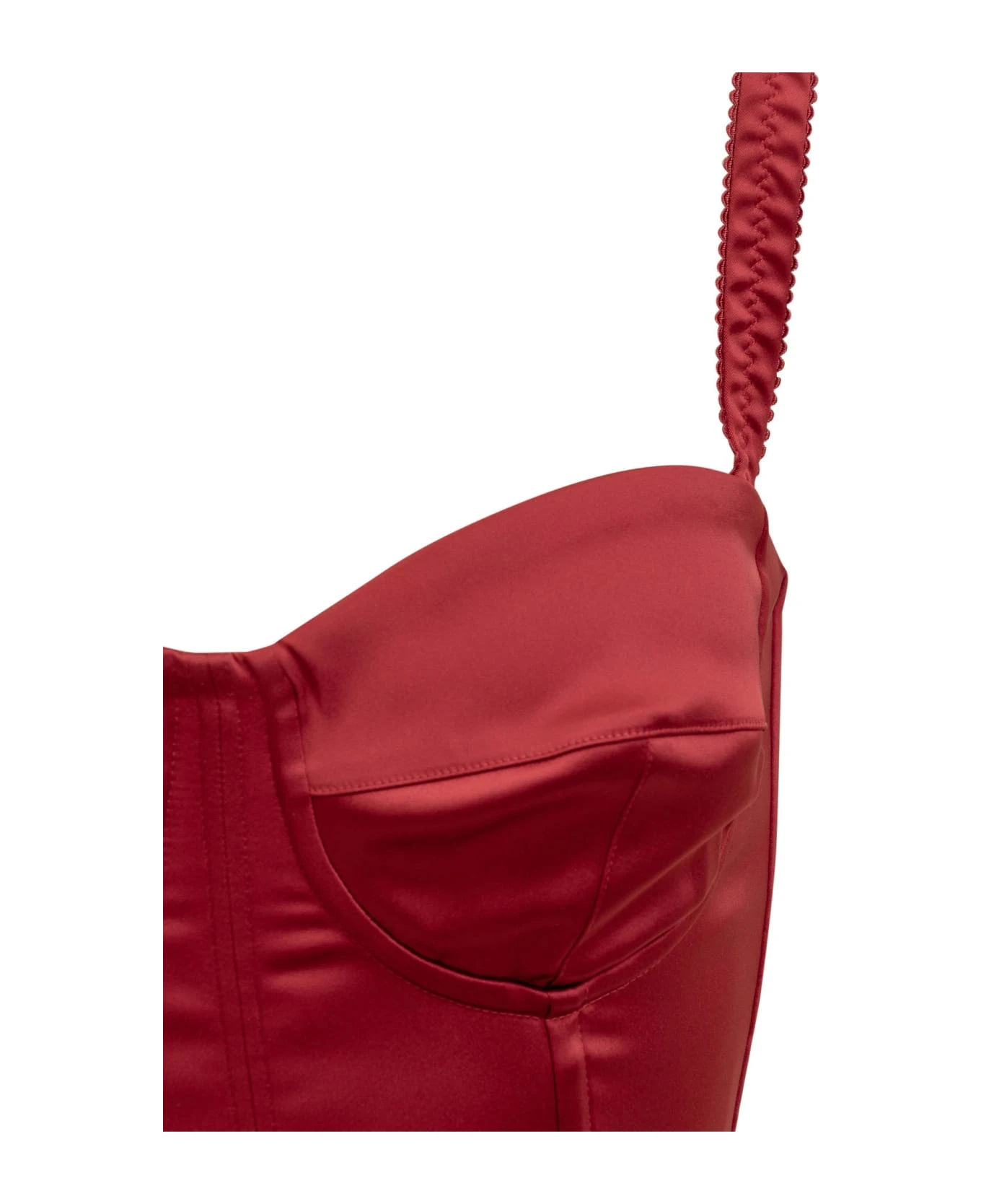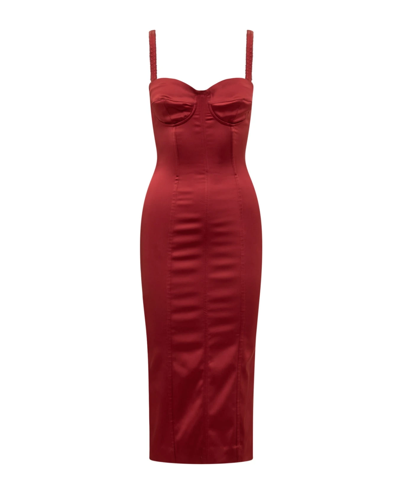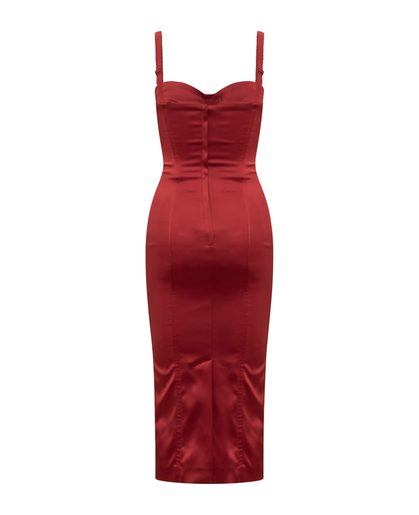 Red sleeveless dress. Neckline on the front. Zip closure on the back. Slim fit. Midi length.
