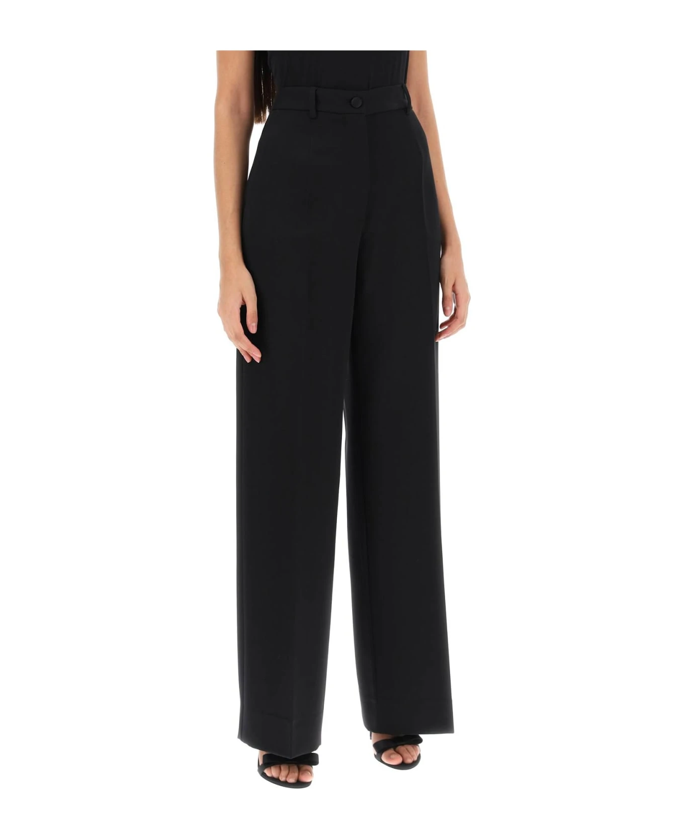Tailoring pants by Dolce&Gabbana crafted in pure virgin wool twill with wide leg enhanced by pressed crease. They feature front fastening with zipper fly and satin-covered button, side slash pockets, back welt pockets with buttons and belt loops. Finished with pick-stitching. The model is 177 cm tall and wears size IT 40.
