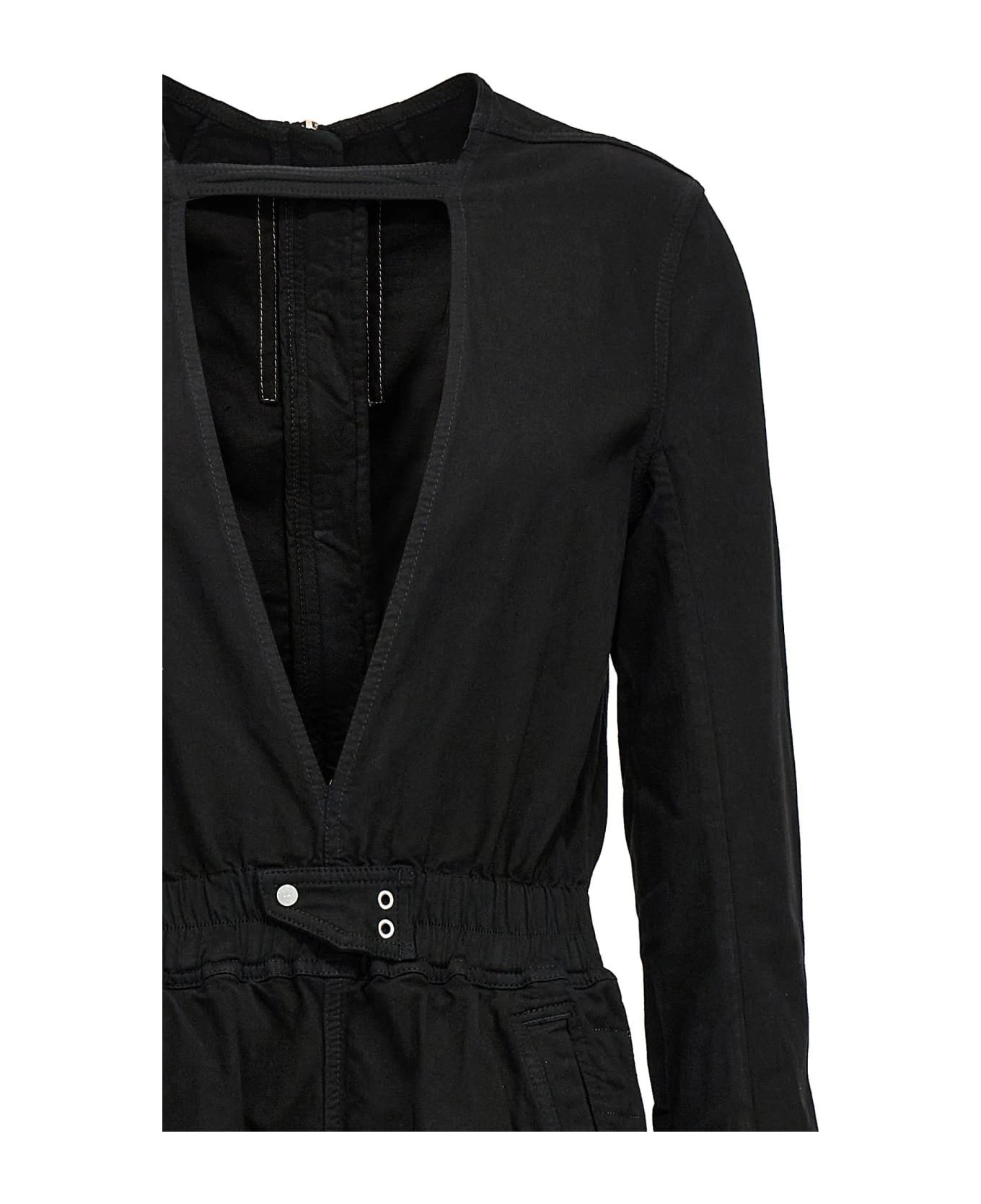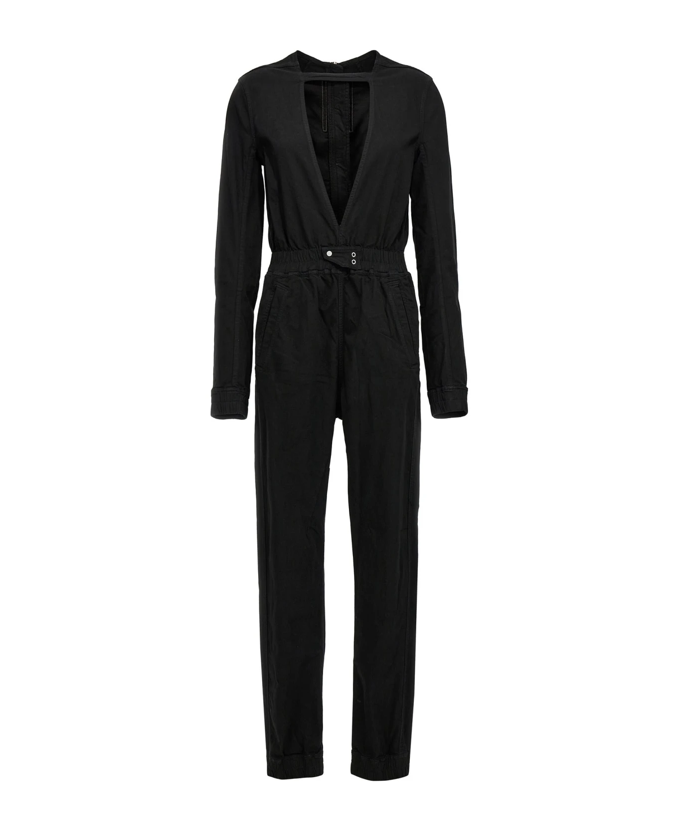 Eclipse Bodybag’ one-piece coated canvas bodysuit, with long sleeves, a front V-neck, a central zip closure at the back, an elastic waistband, pockets, and a long ankle elastic leg.