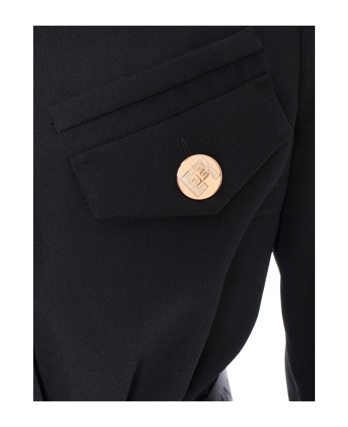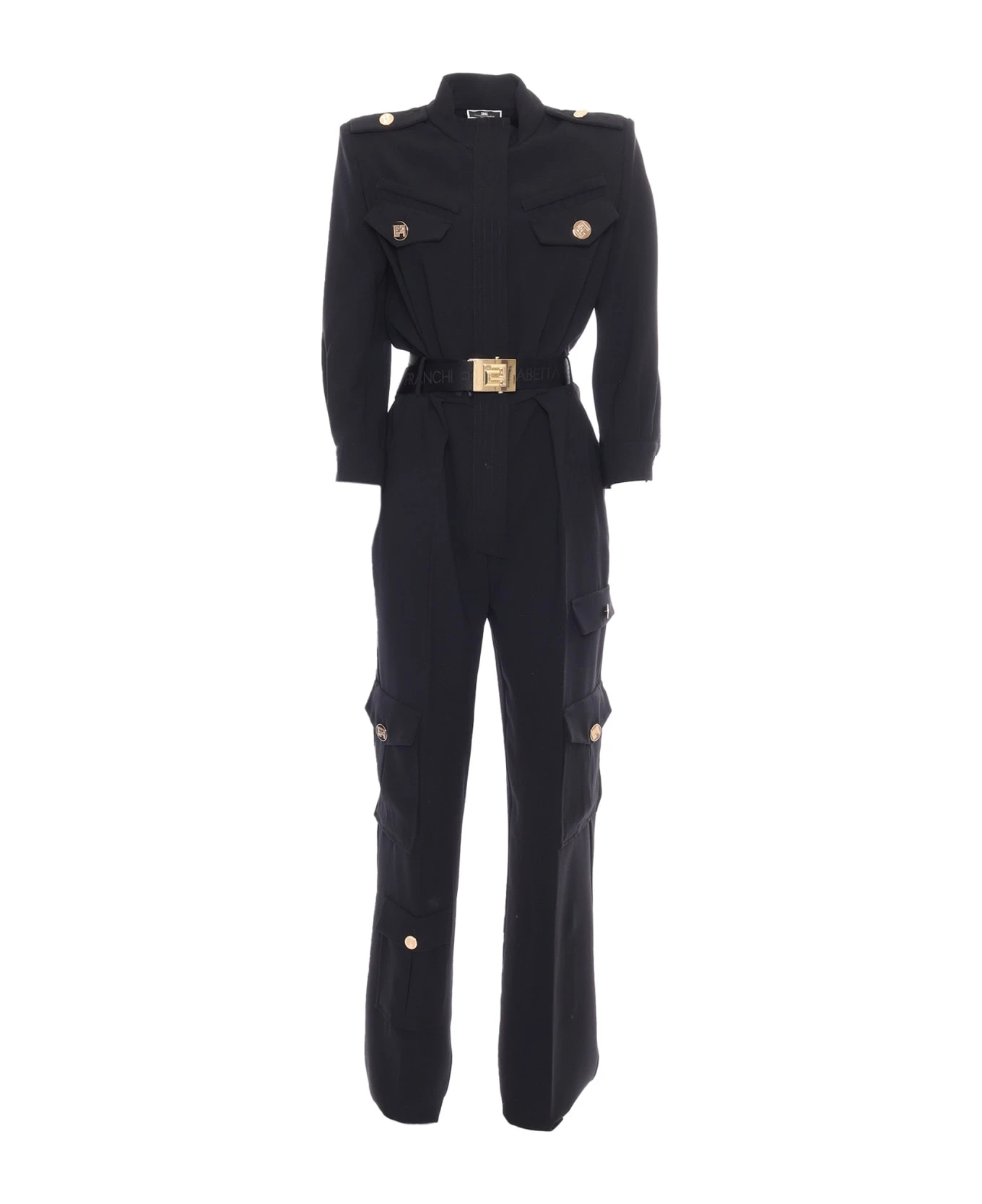 Crepe jumpsuit, wide leg, pockets with golden metal buttons, removable belt with golden metal buckle, zip, buttons and golden metal accessory fastening