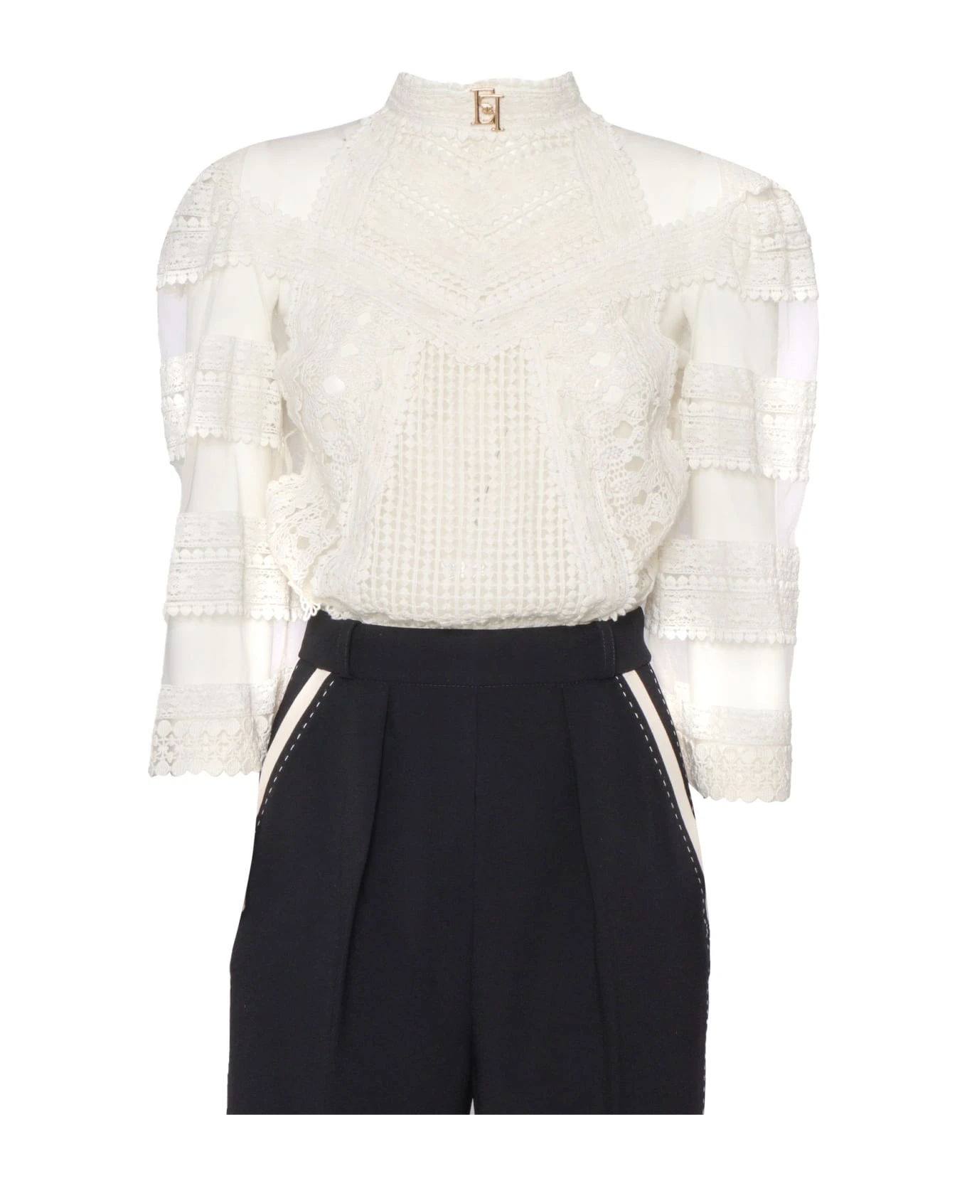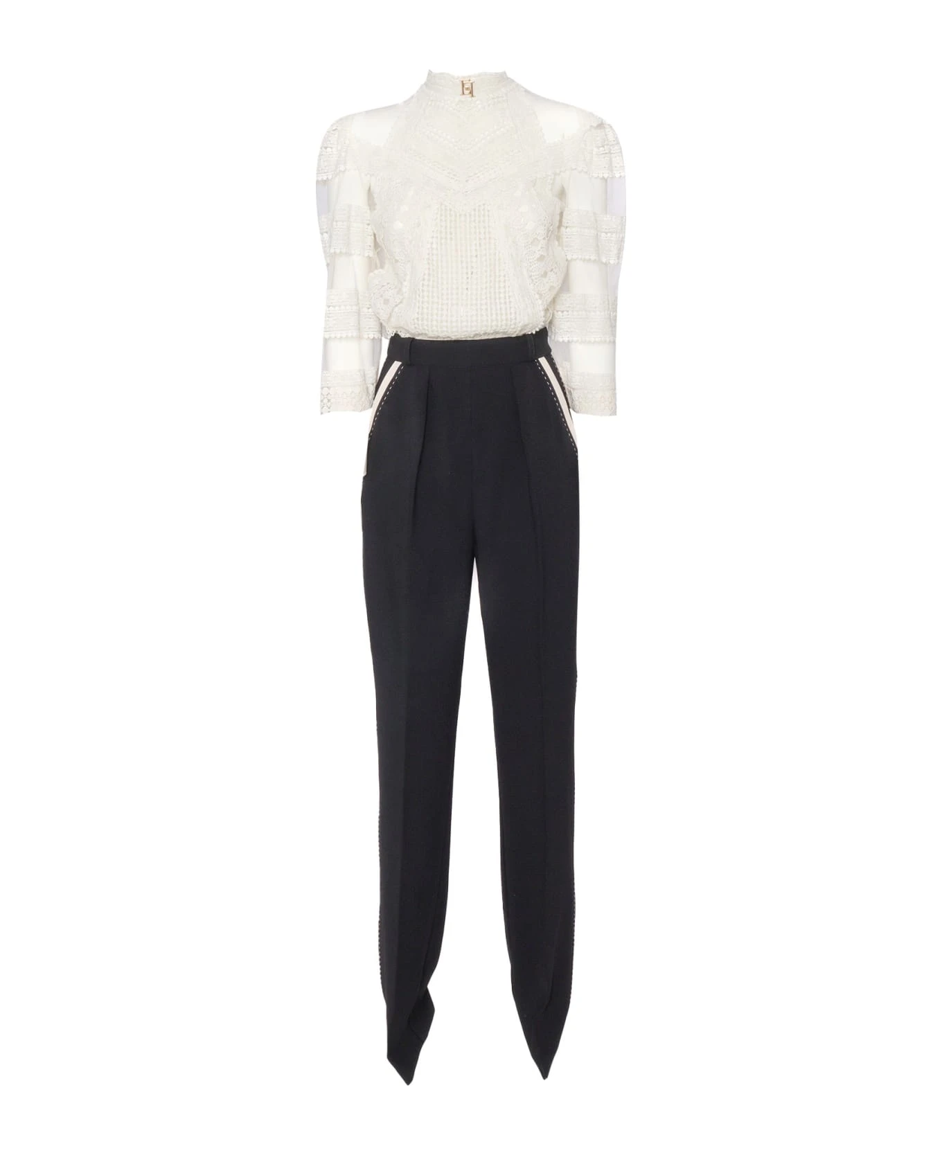 One-piece suit, detachable shirt in macramé lace, high collar with gold-finish logo, wide 3/4 sleeves, invisible zip fastening on the back, straight crepe pants, contrasting side band
