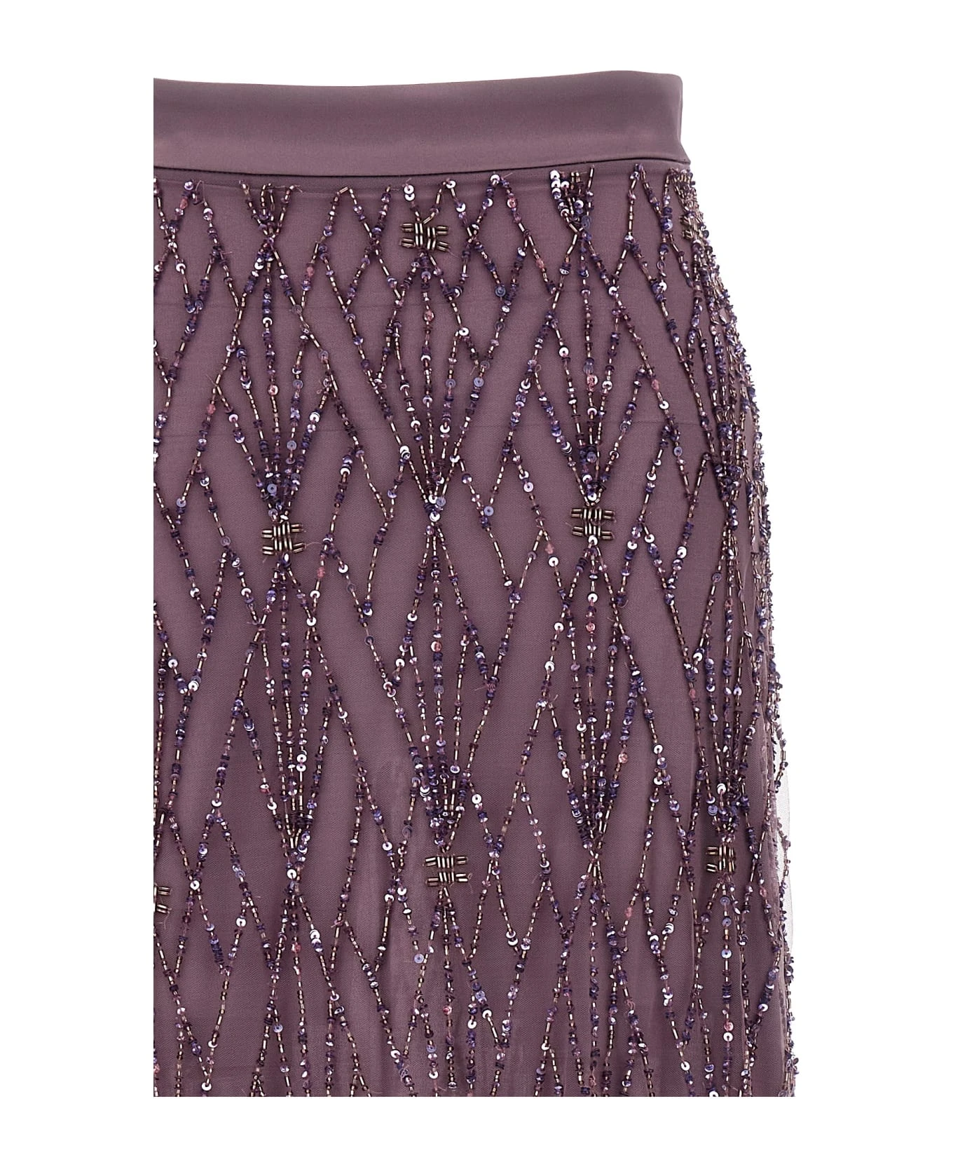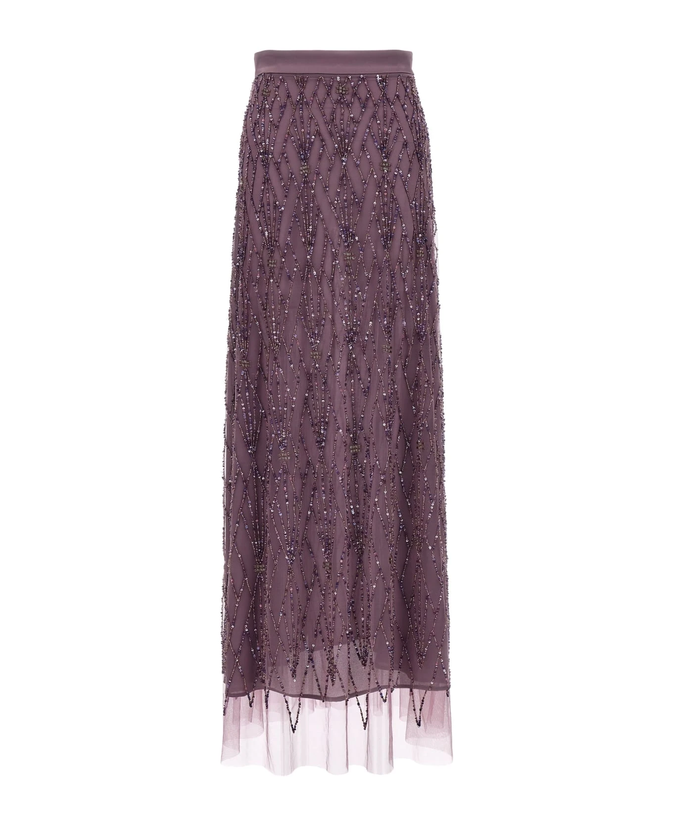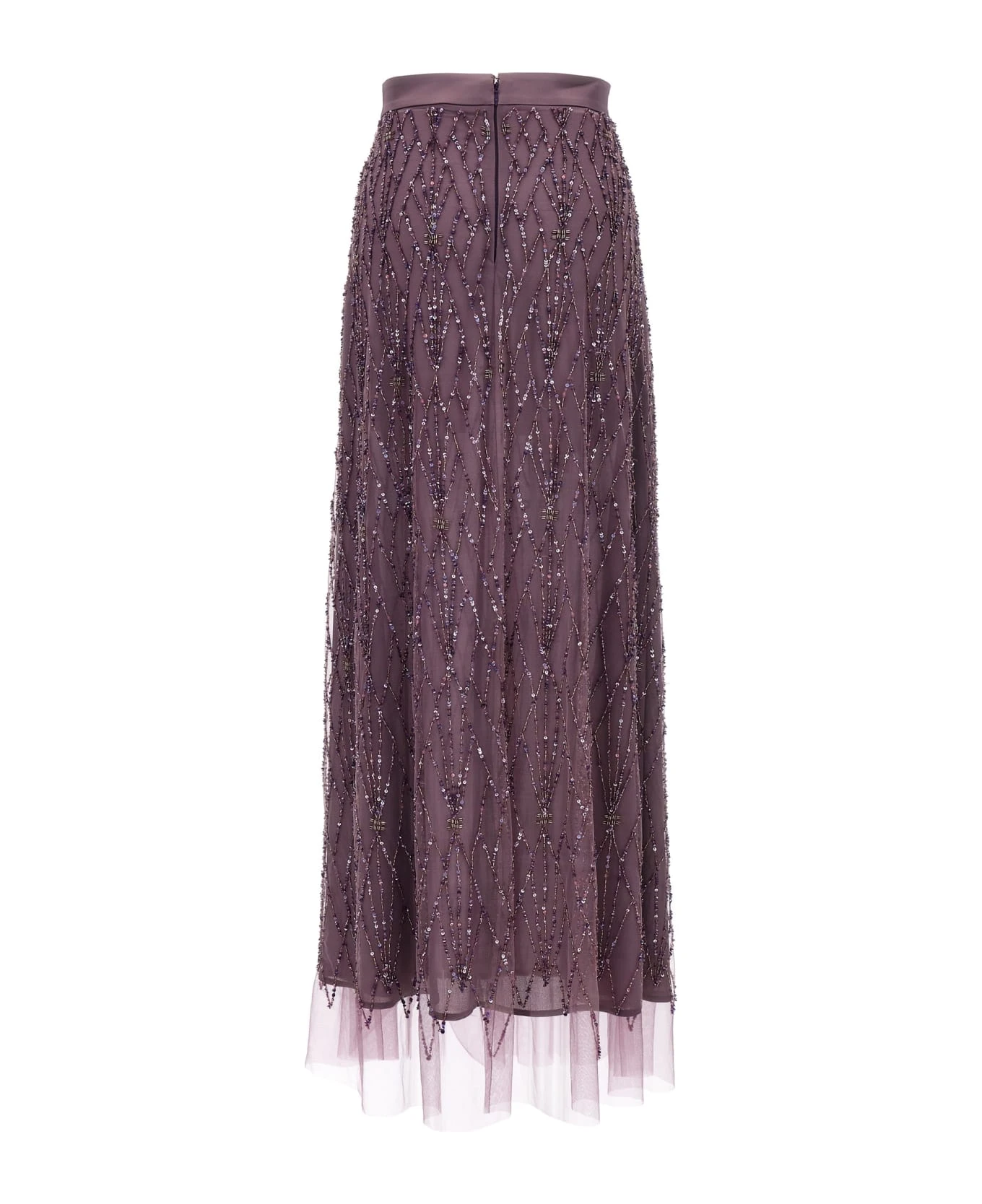 Long tulle skirt with all-over sequin appliqué, georgette lining, and back zip closure.
