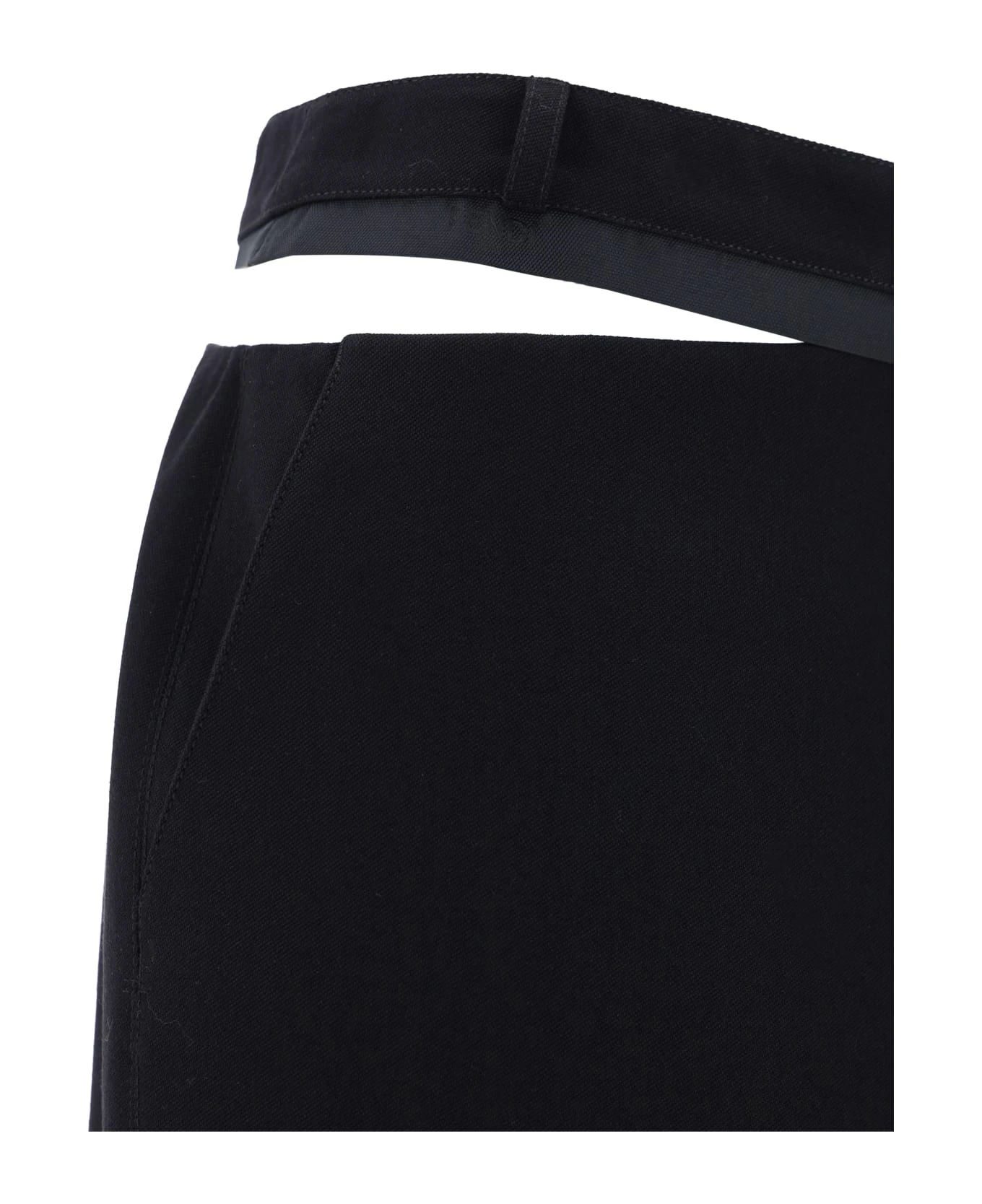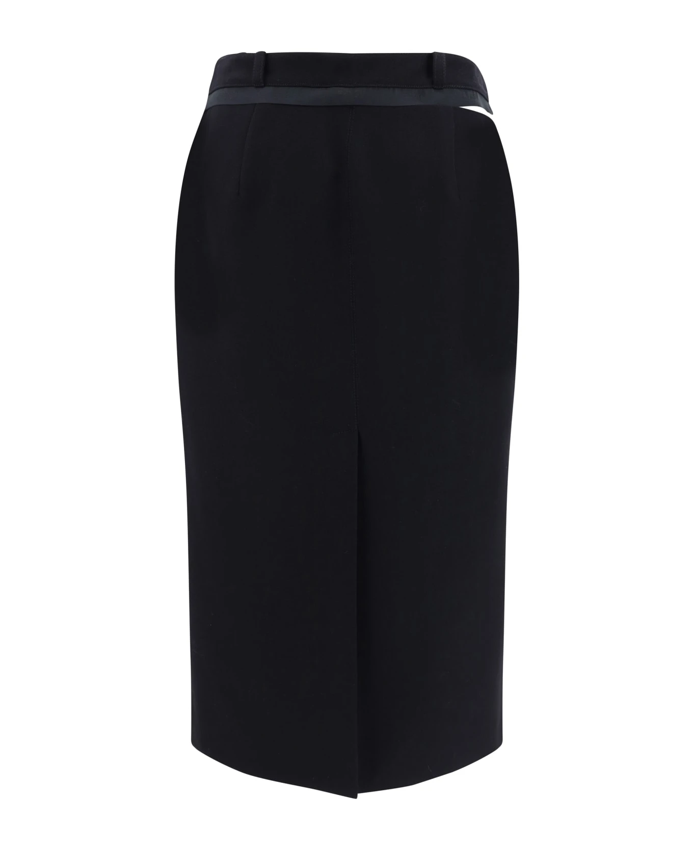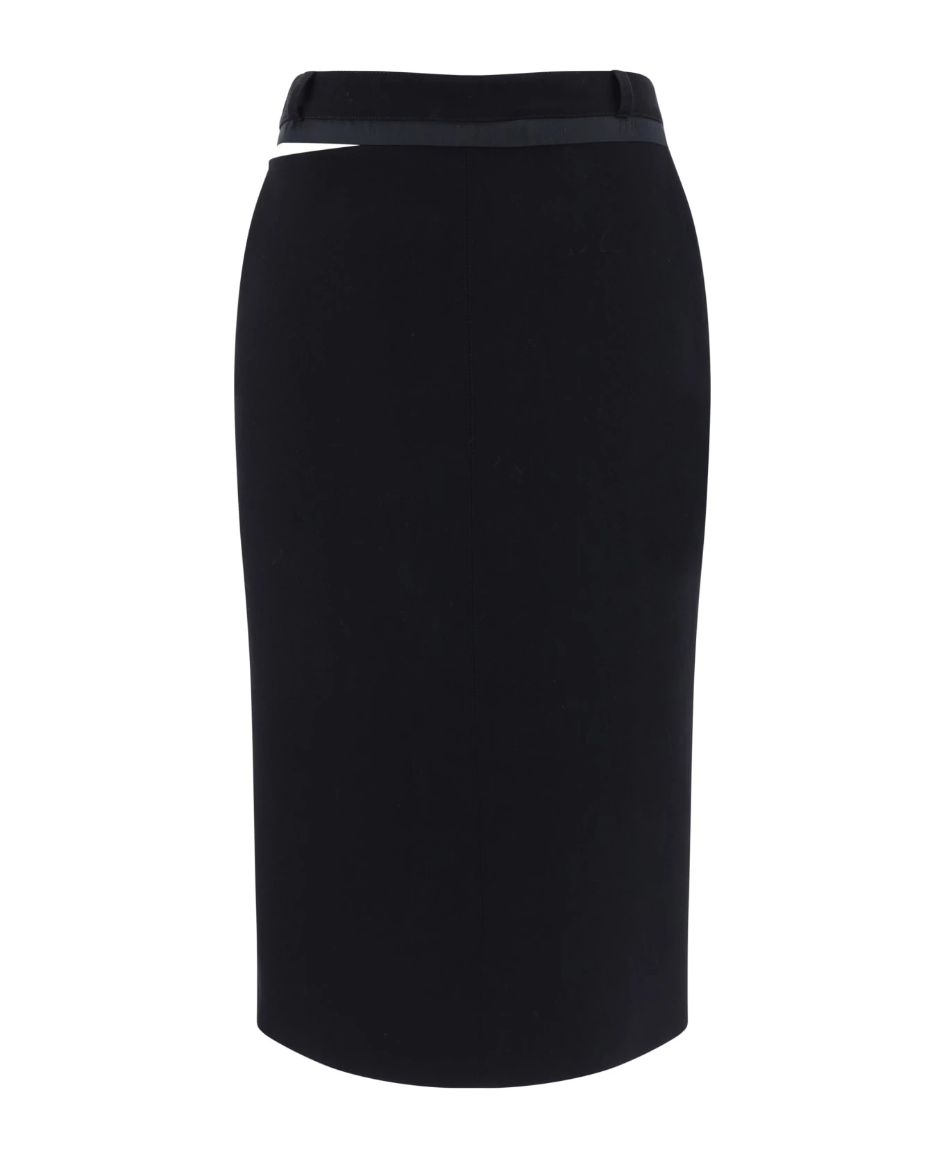Wool grain de poud skirt by fendi, band with iconic brand logo repeated at waistband, side closure by invisible zipper, two side slash pockets, cut-out detail on mid-waist, midi pattern, wide back slit.