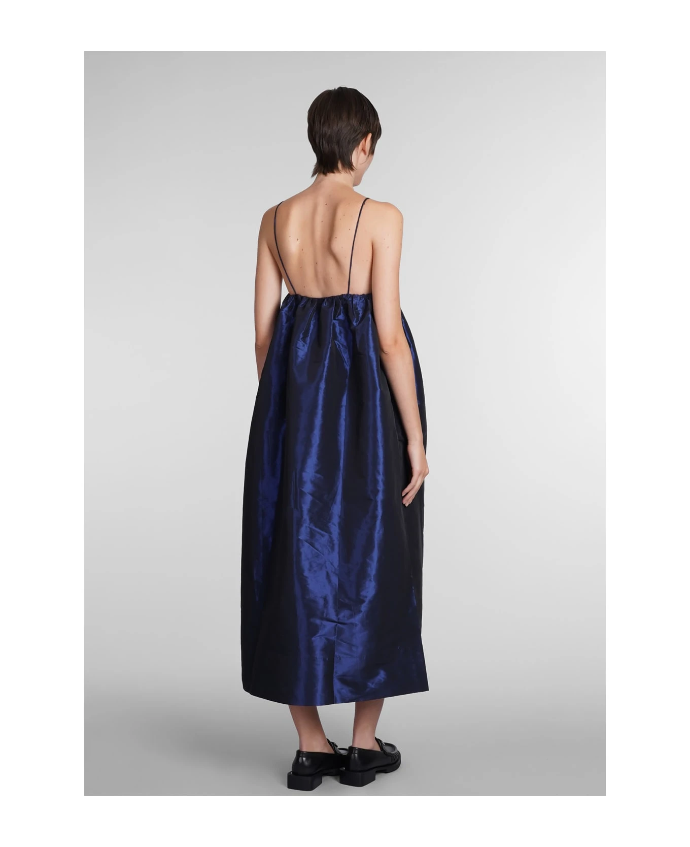 Dress in blue polyester, deep V neckline, thin straps, pockets, zip clousure, taffeta, 50% Polyester, 50% polyester recycled, Made in China, Model is 180 cm and wears 36