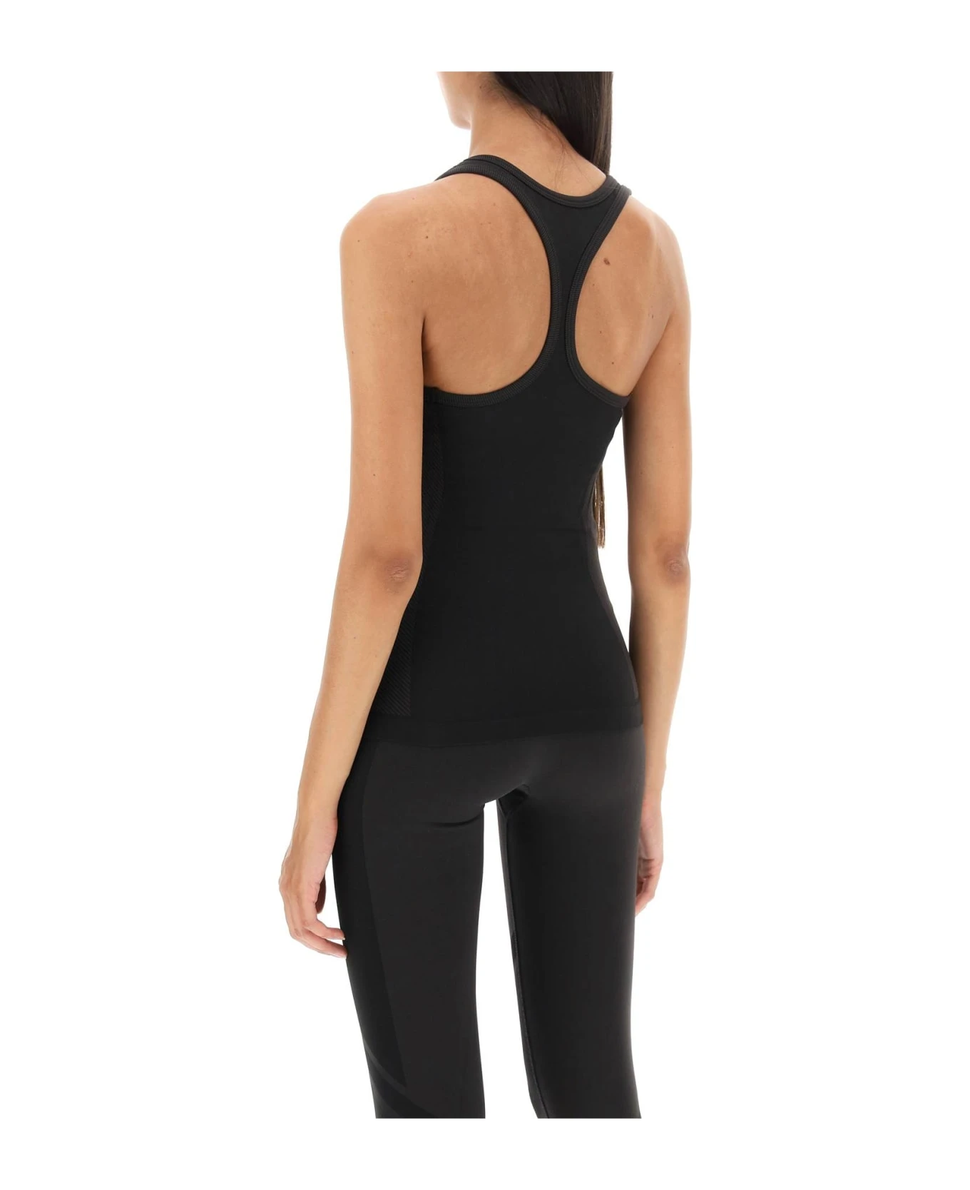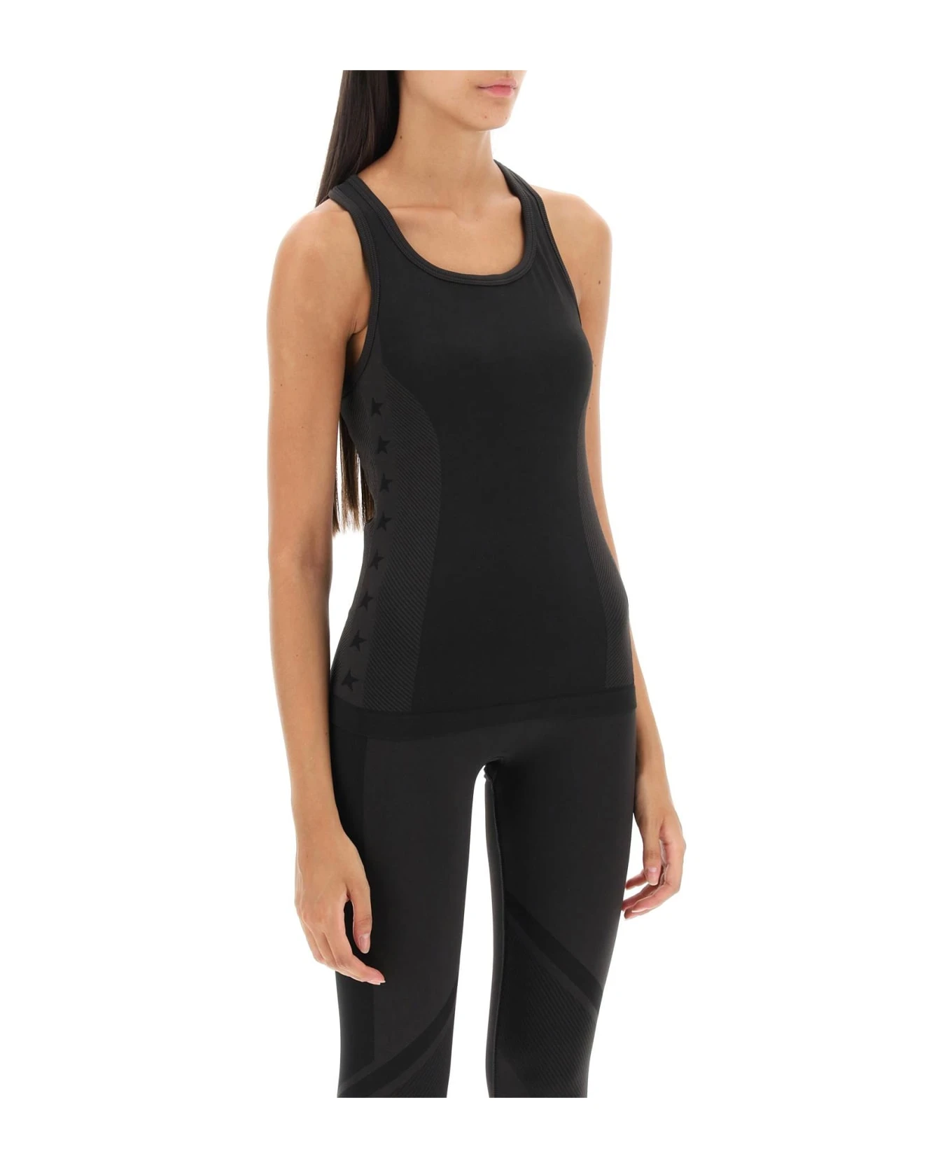Sports top by Golden Goose made from technical jersey. It features racerback neckline, side bands decorated with star pattern and inner bandeau bra. Fitted. The model is 177 cm tall and wears size S/M.