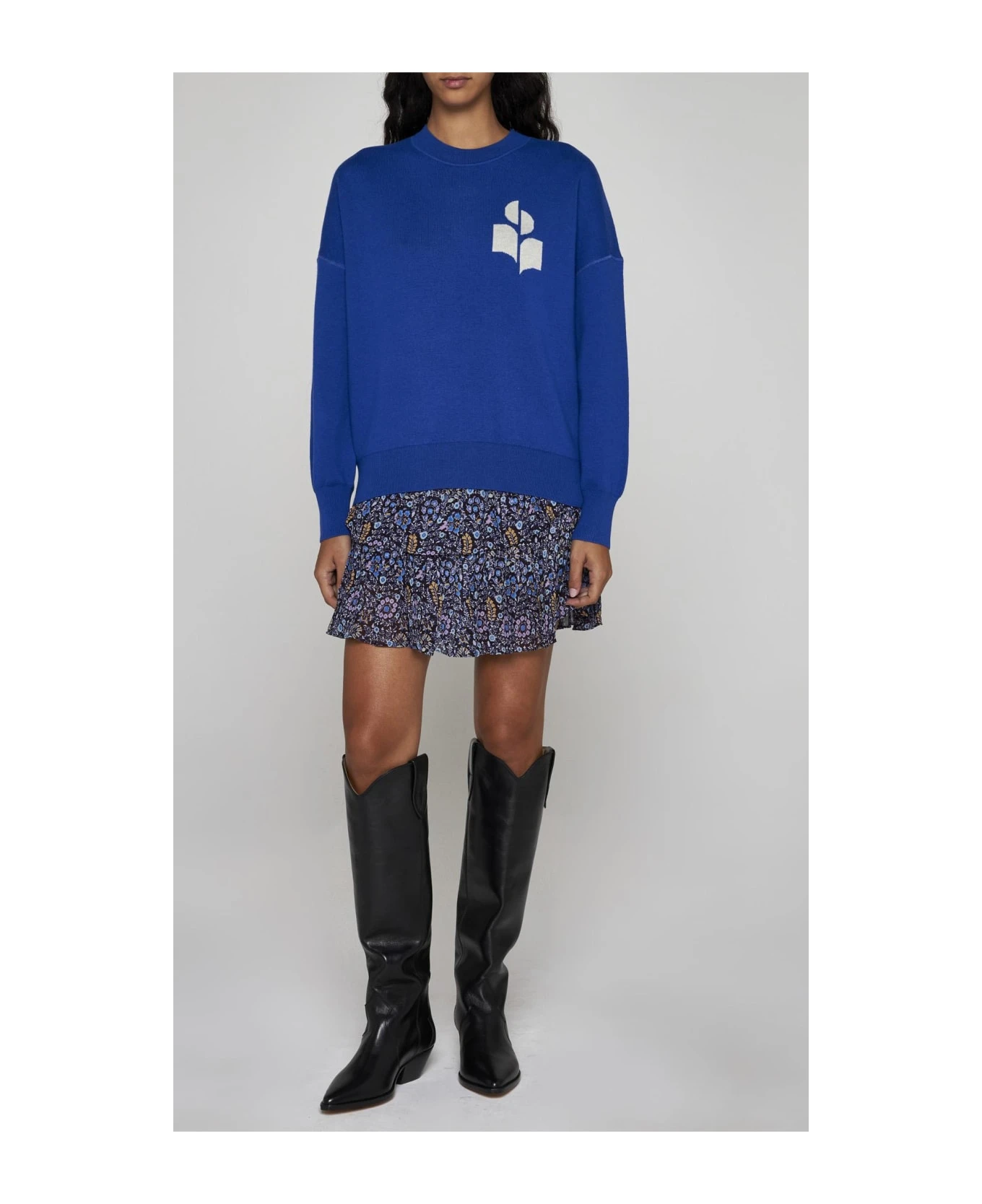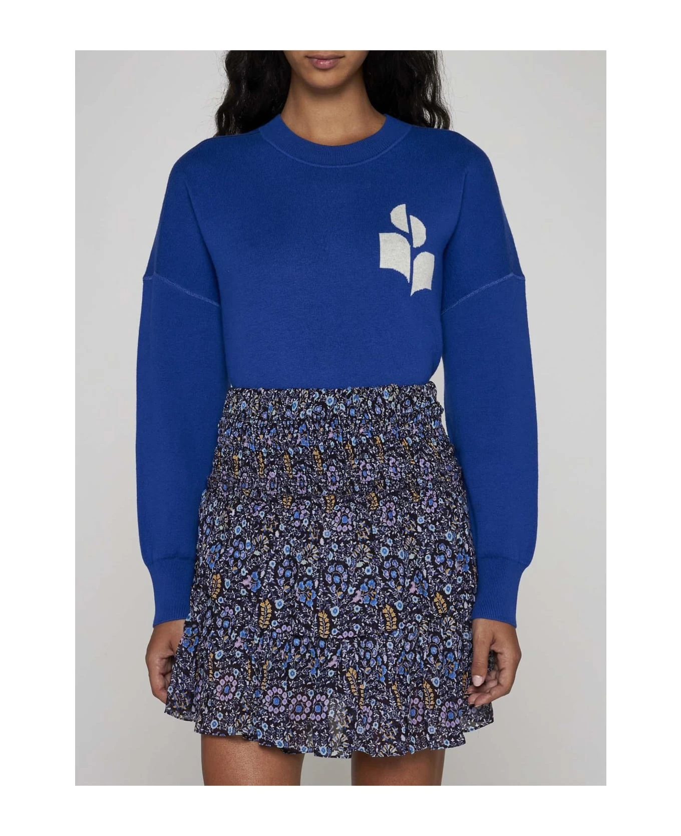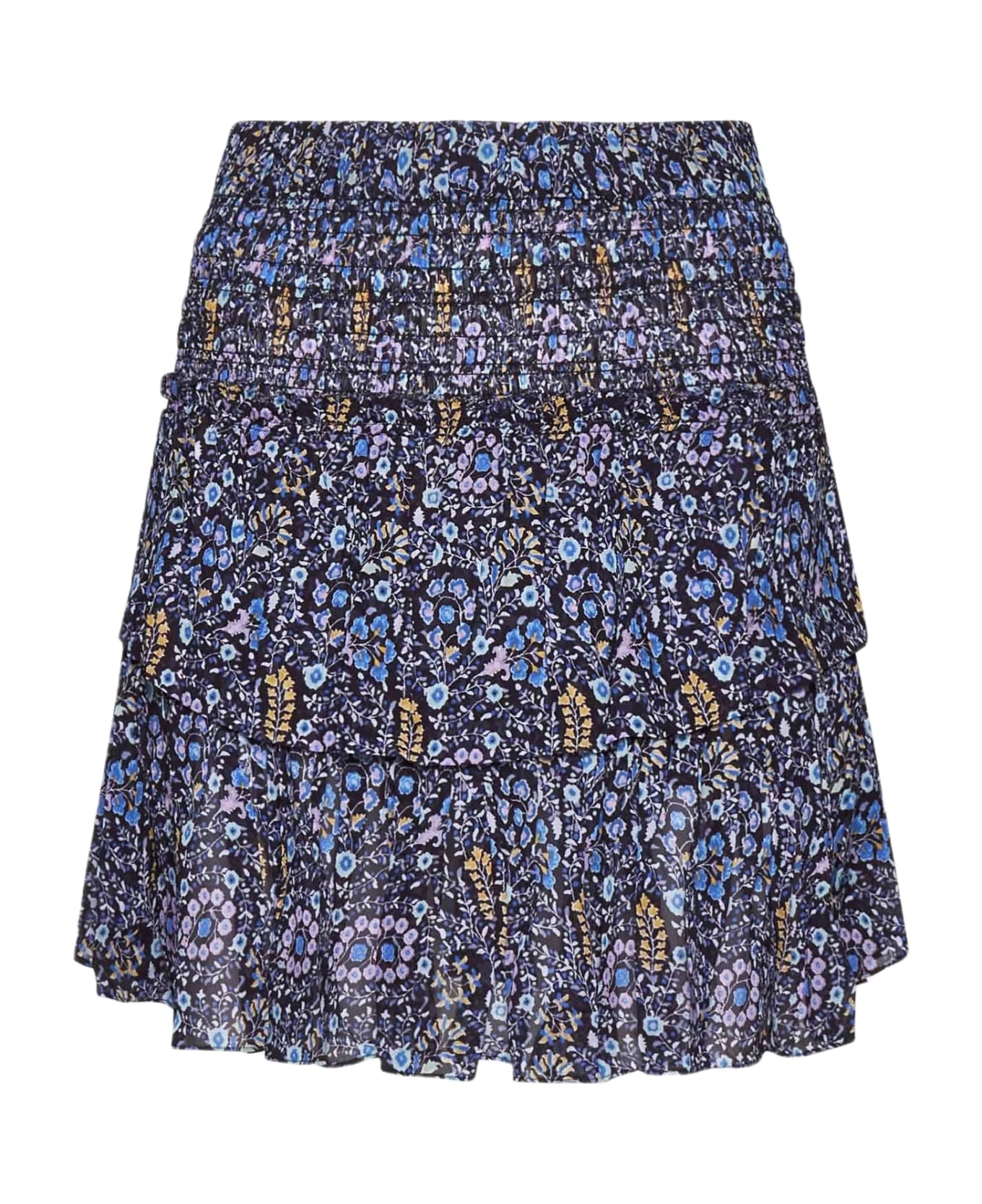 Marant Etoile’s Hilari viscose miniskirt featuring a multicolor floral print on a midnight blue background, smocked waistband and double flounces.