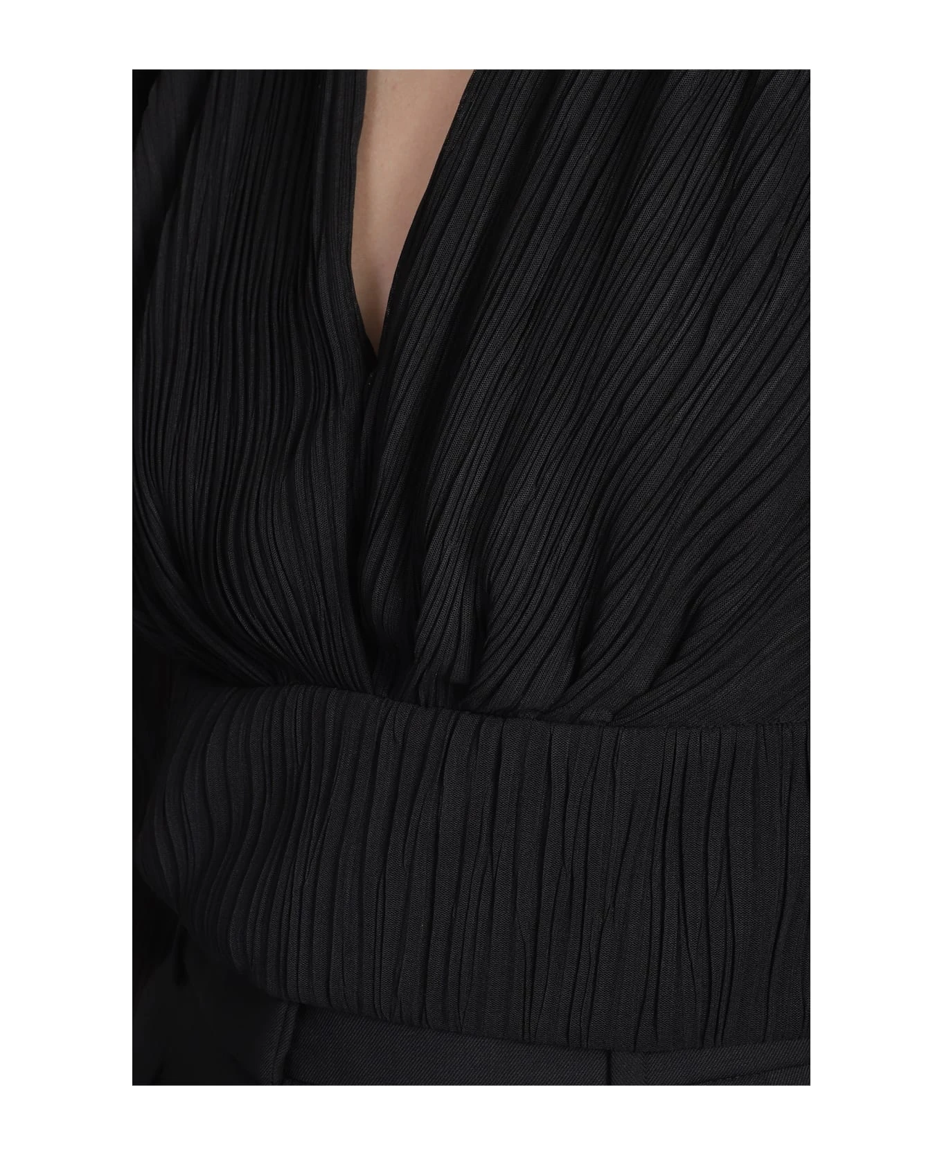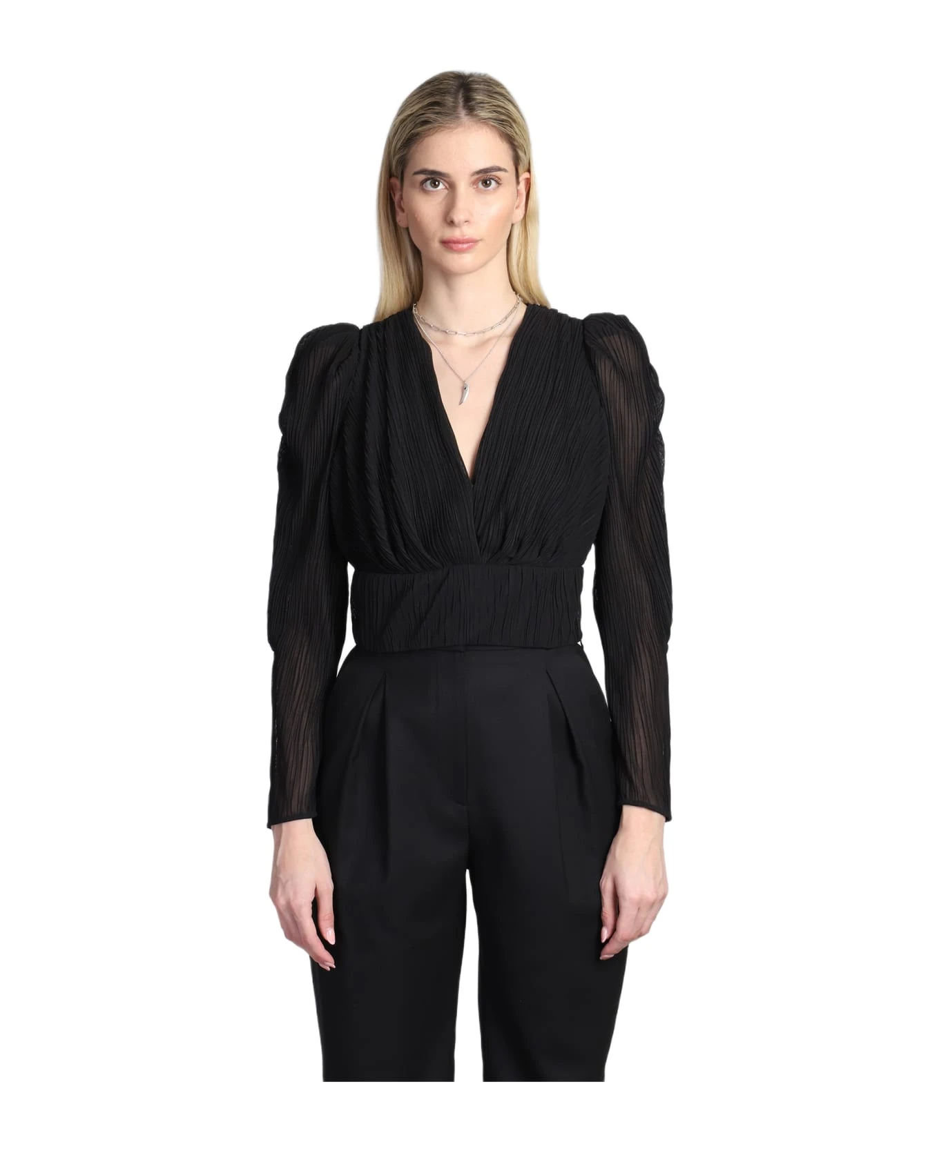 Amili Topwear in black viscose, V neck, long sleeves, crumpled effect, 91% polyester, 9% elastane, Made in China, Model is 180 cm and wears 38