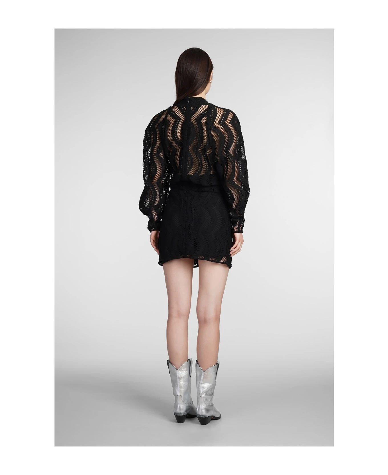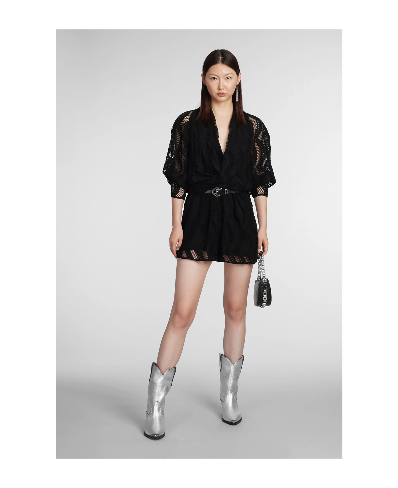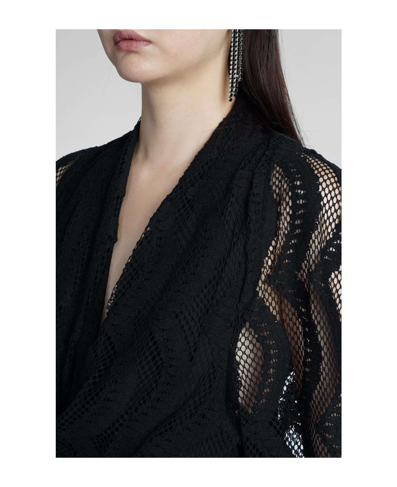 Emsi Dress in black cotton, V neck, long sleeves, back zip fastening, perfored, 76% cotton, 20% polyamide, 4% elastan, Made in Portugal, Model is 1. 77 cm and wears size 36