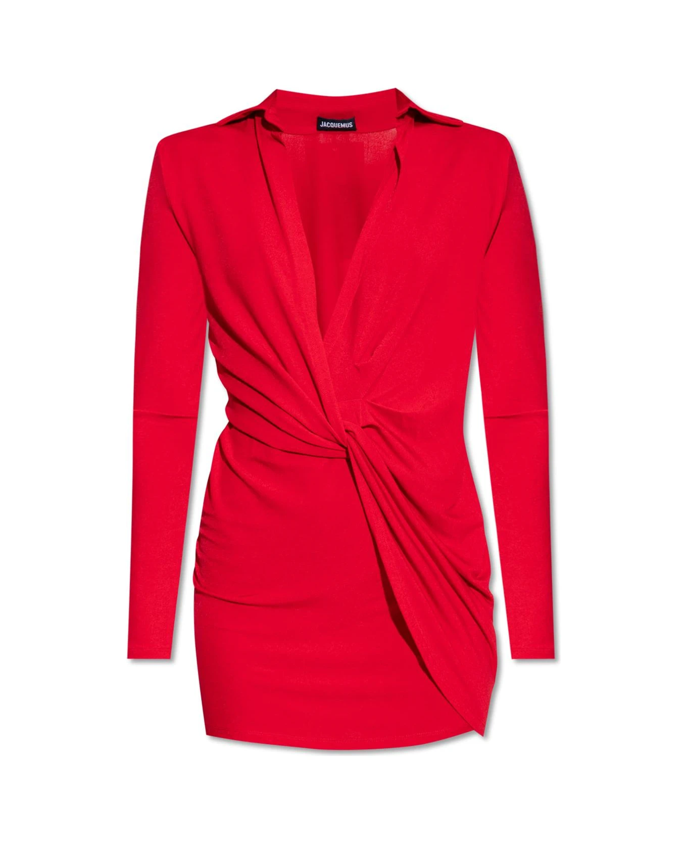 Red ‘Bahia’ mini dress from Jacquemus. This draped design features a plunging neckline finished with a collar and long sleeves.