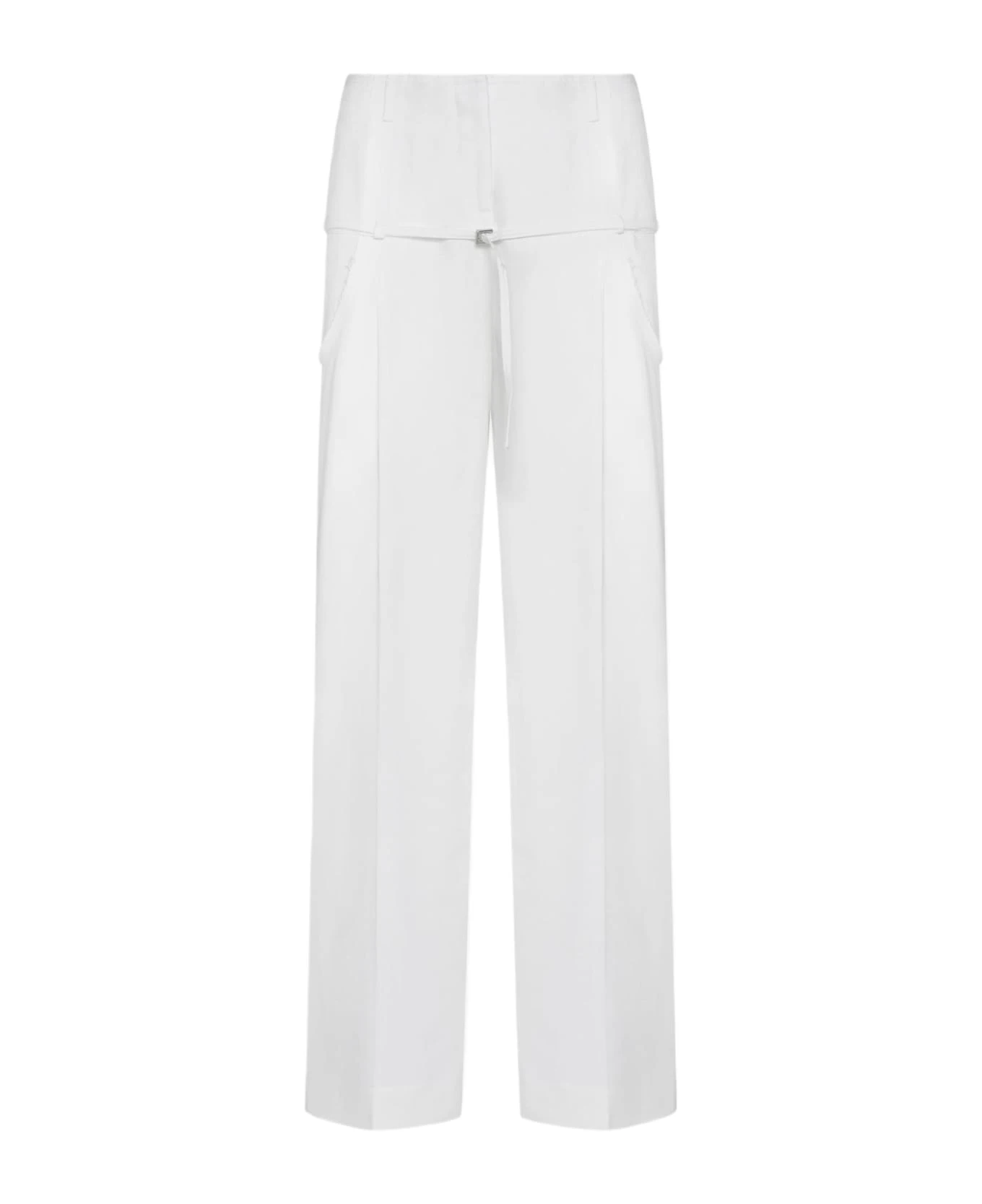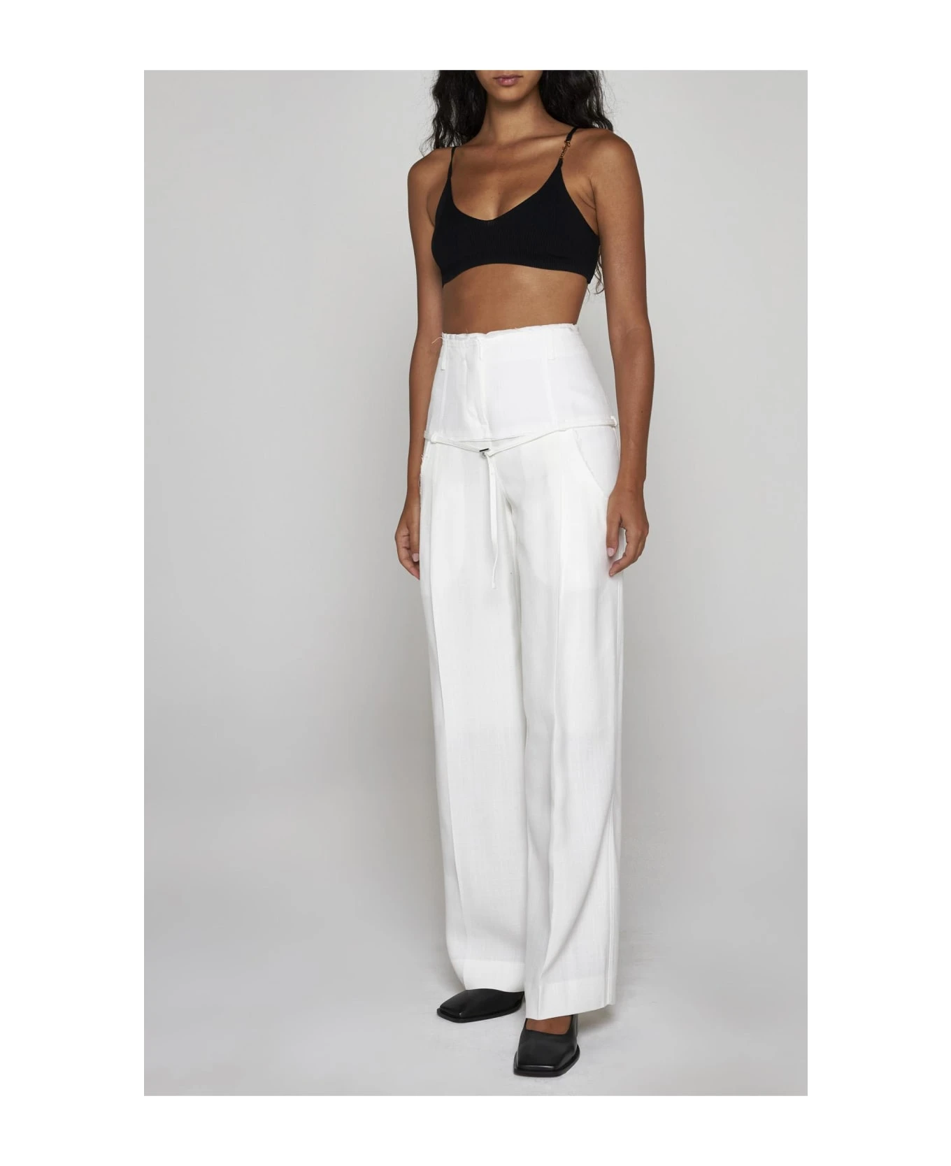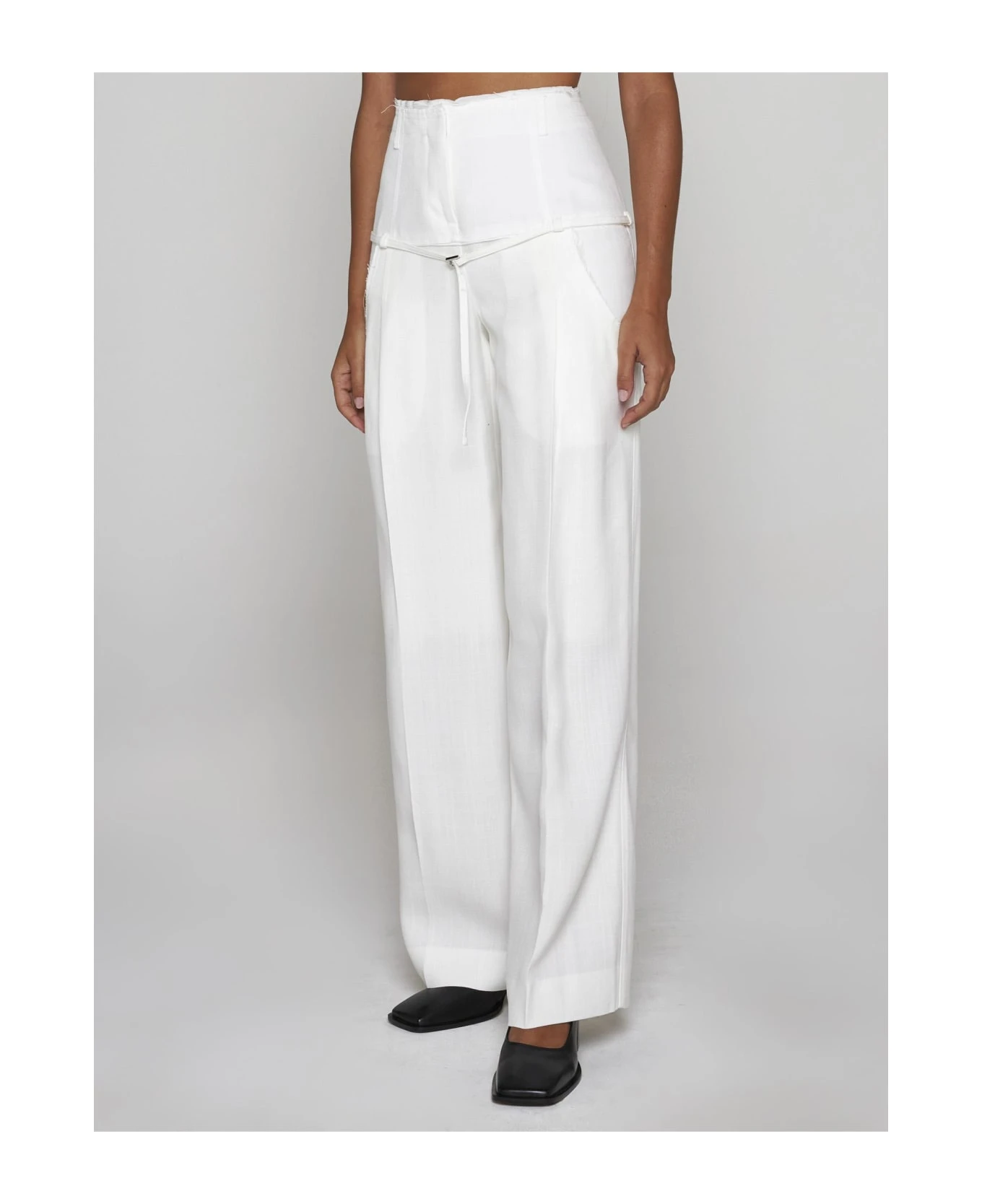 Jacquemus’ Criollo white viscose trousers featuring high waist, belt loops, concealed zip and button fastening, low belt loops with thin belt and silver-tone metal buckle, low side pockets, wide and straight leg with ironed crease and raw cut edges.
