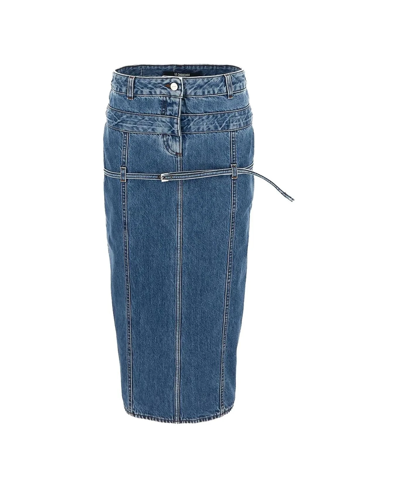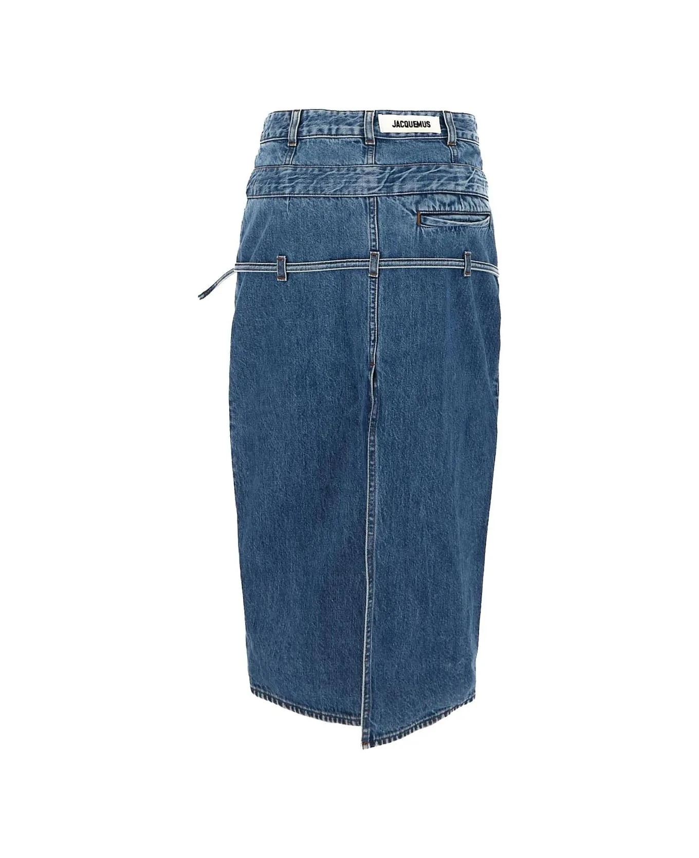 Jacquemus denim midi skirt in light blue stonewash cotton with low rise, contrasting stitching, button and zip closure, a back pocket, integrated double waistband, removable thin buckled belt and belt loops, grosgrain logo ribbon on the back and long back slit.