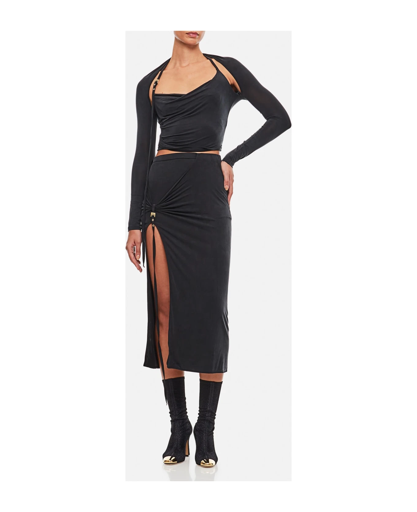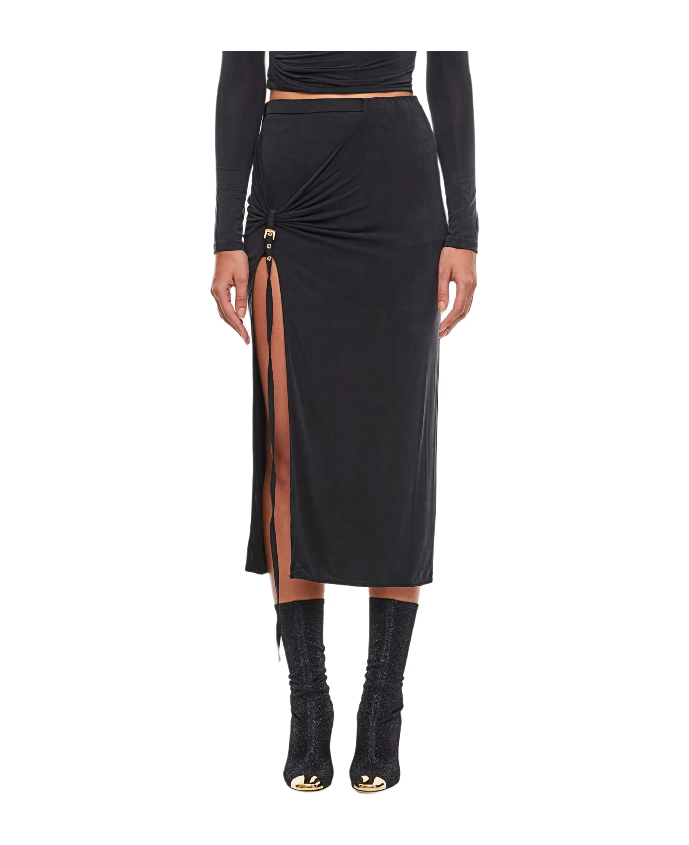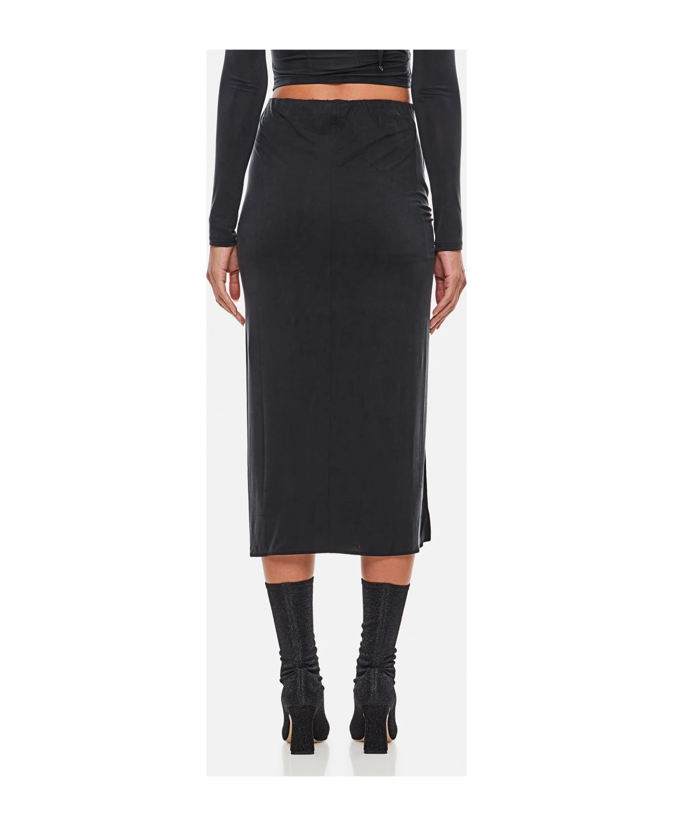 High-waisted. Side drape with adjustable drawstring. High side slit. Slim fit. Color: black.