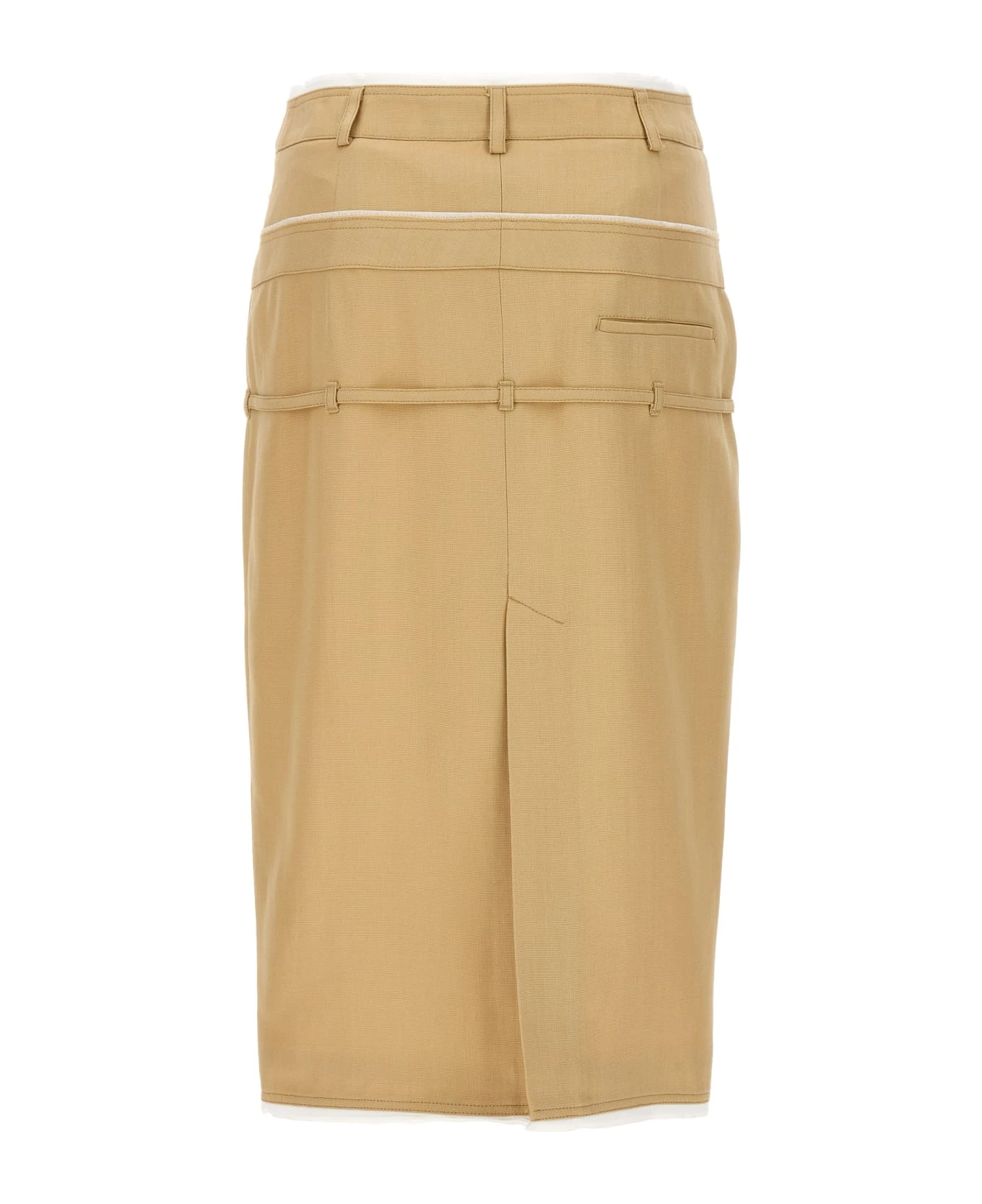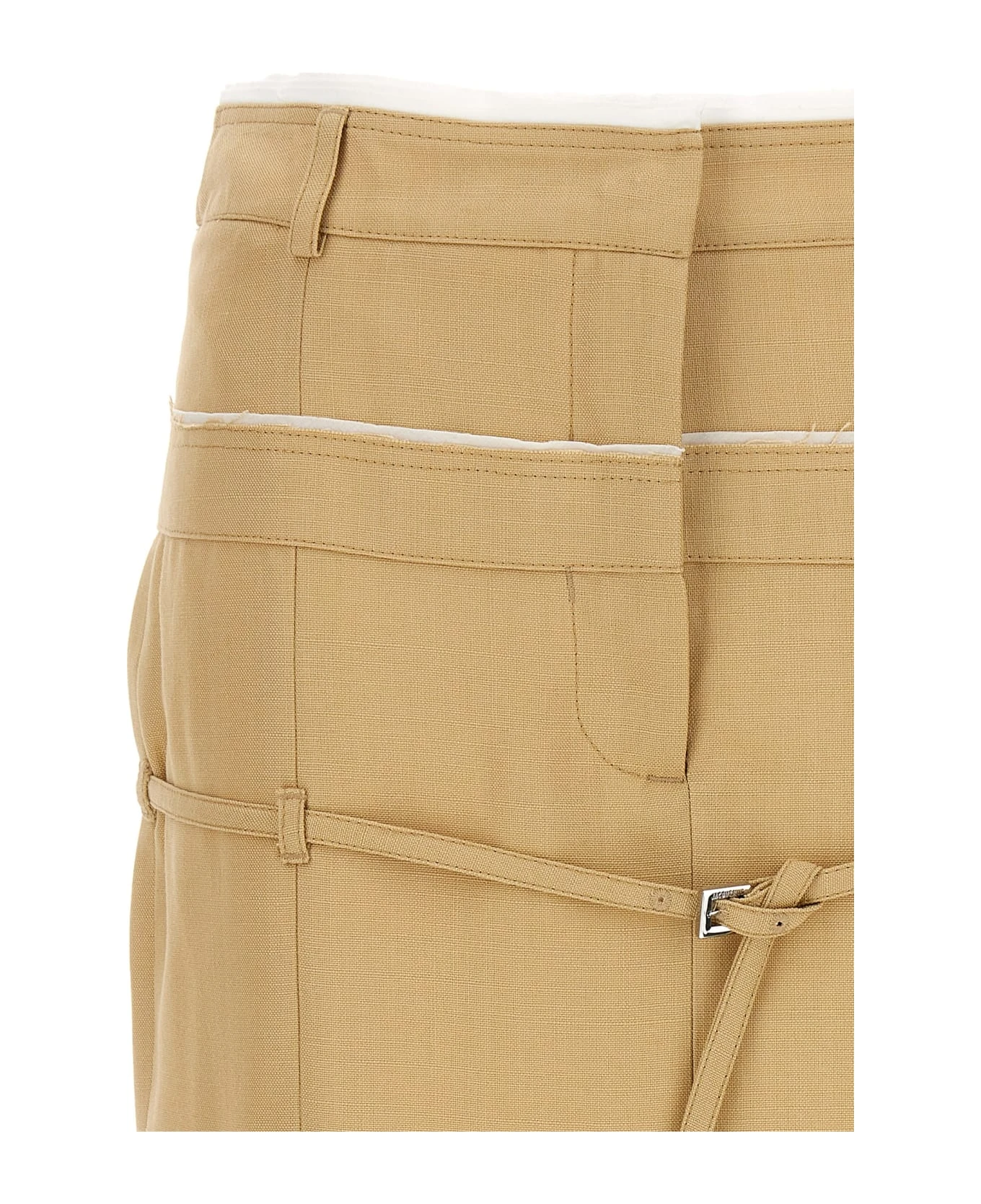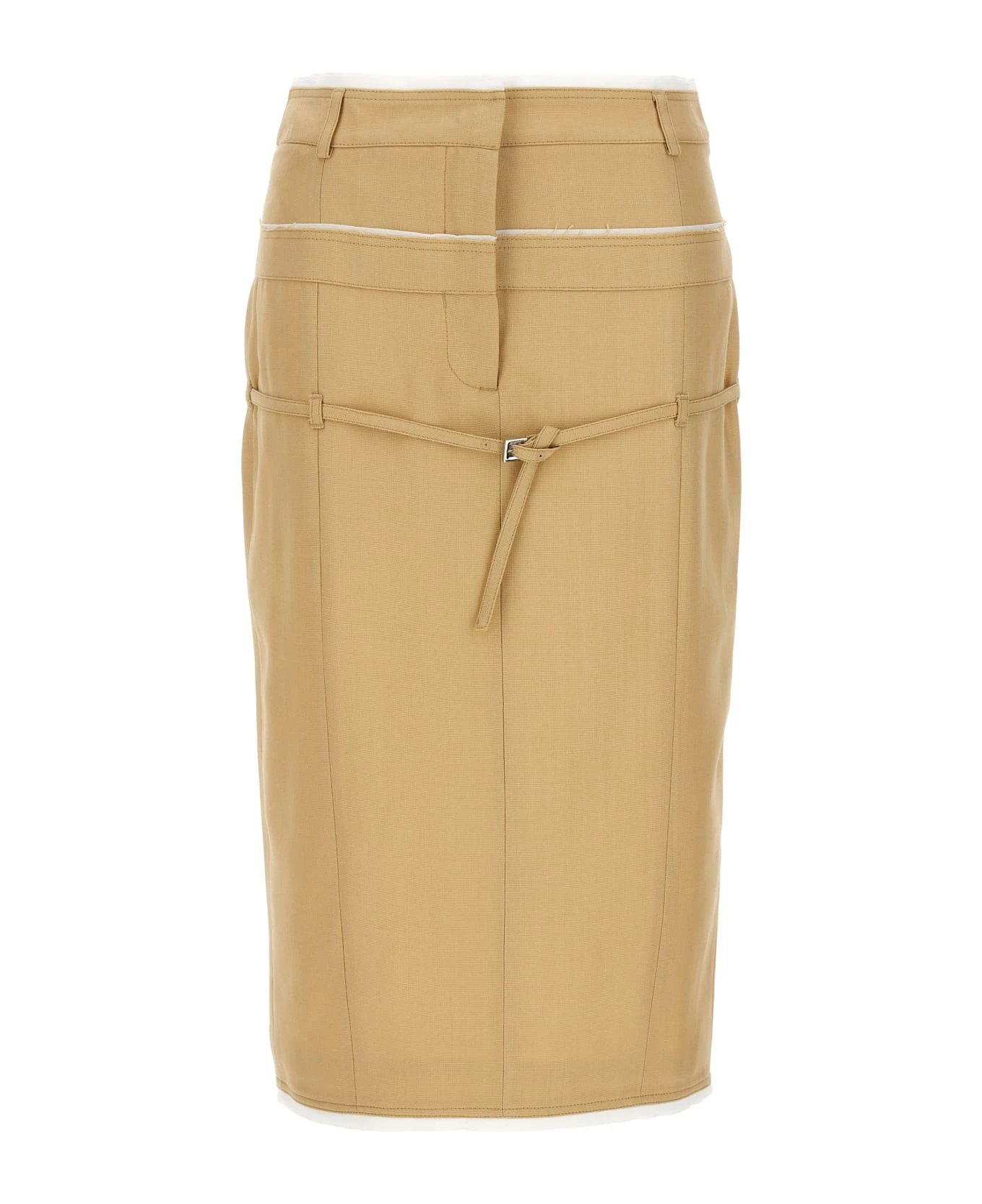 ‘La Mini Jupe Caraco’ viscose skirt with hook and button zip closure, fabric strap detail with adjustable buckle, back split.