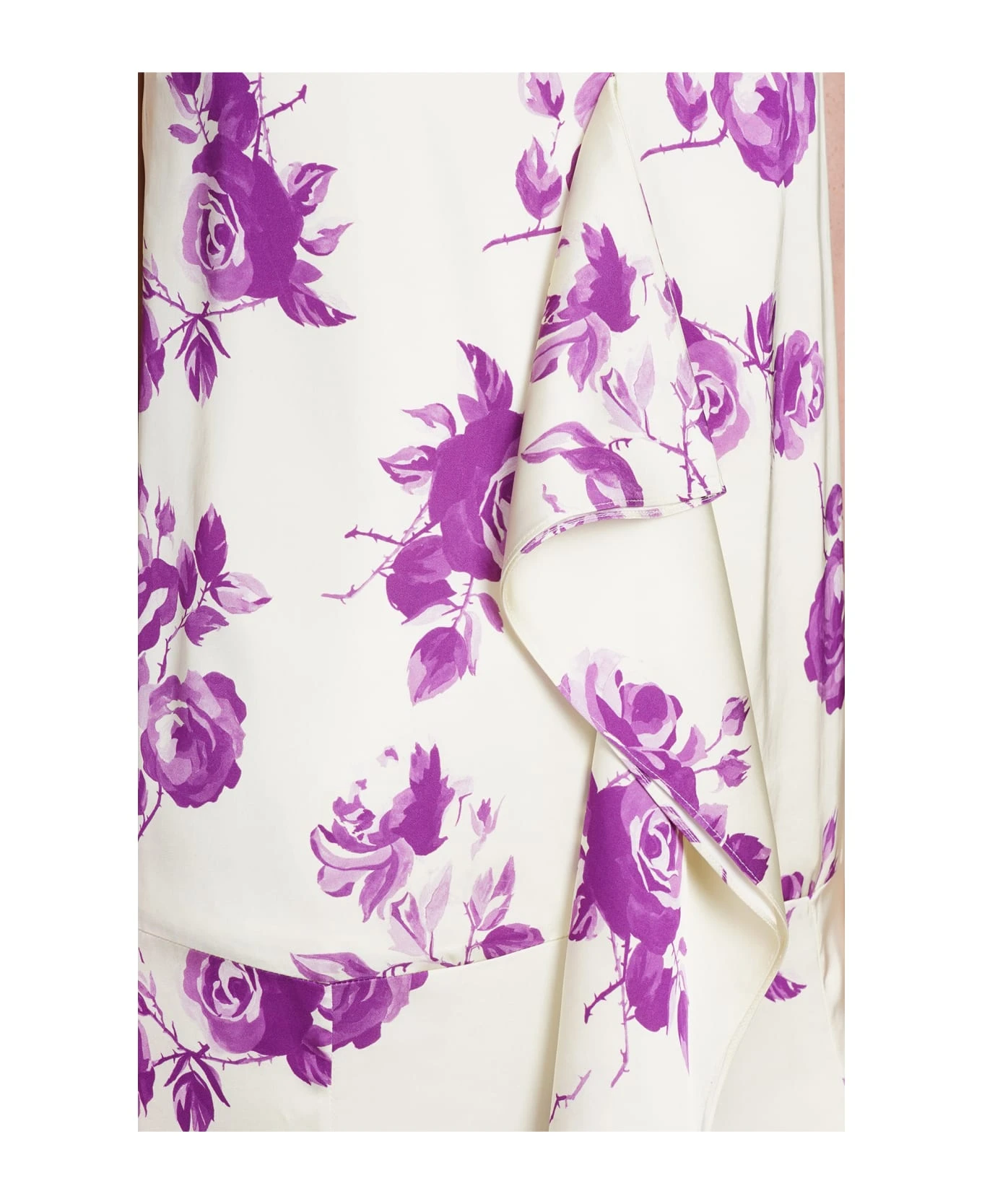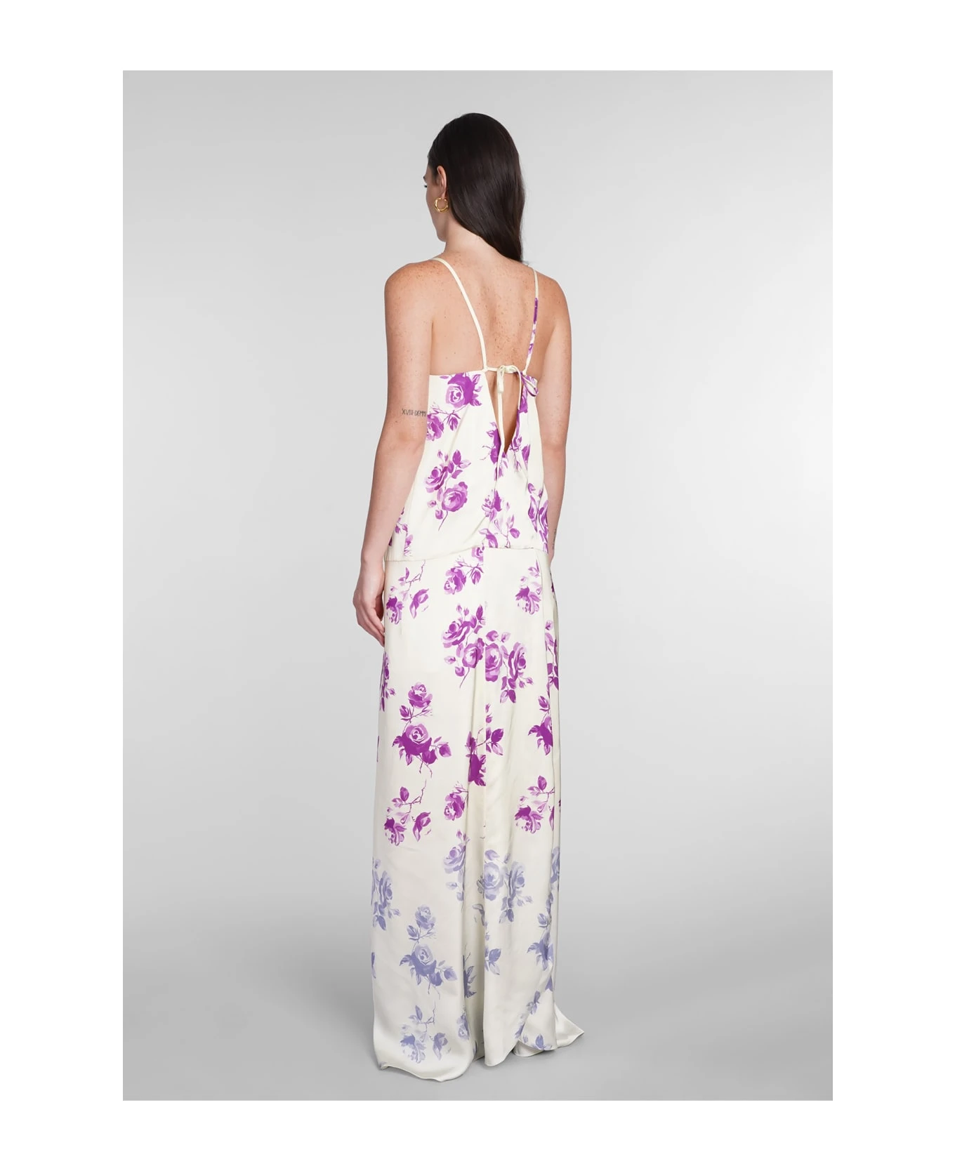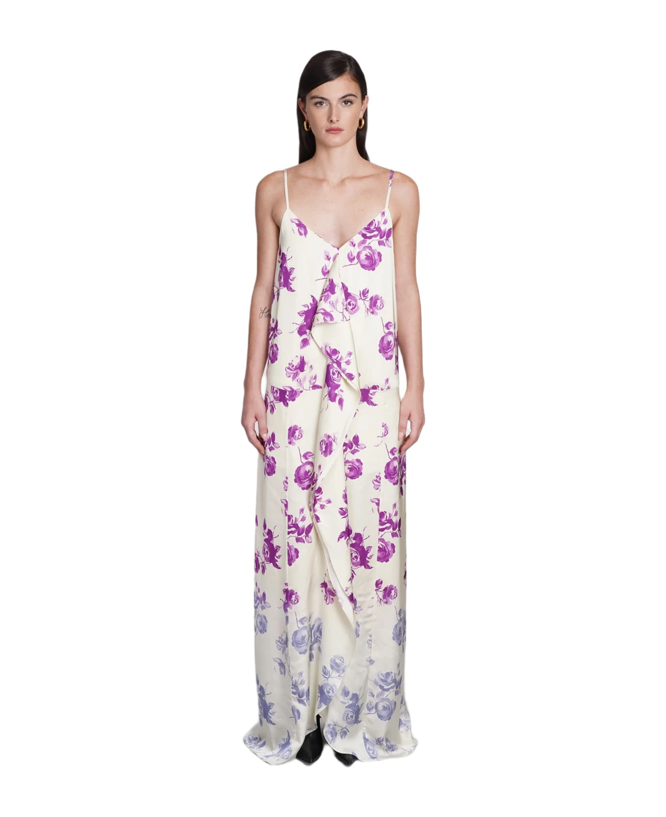 Dress in beige viscose, thin straps, ruffles, floral print, front slit, 100% Viscose, Made in Italy, Model is 180 cm and wears 36