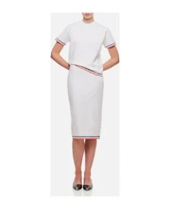 Light beige cotton denim midi skirt, front button fastening, calf-length, panelled design, belt loops, pencil design