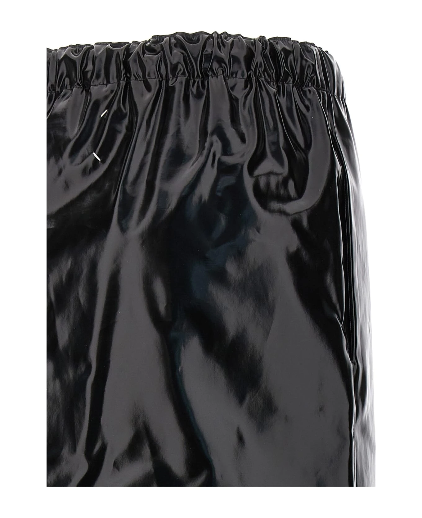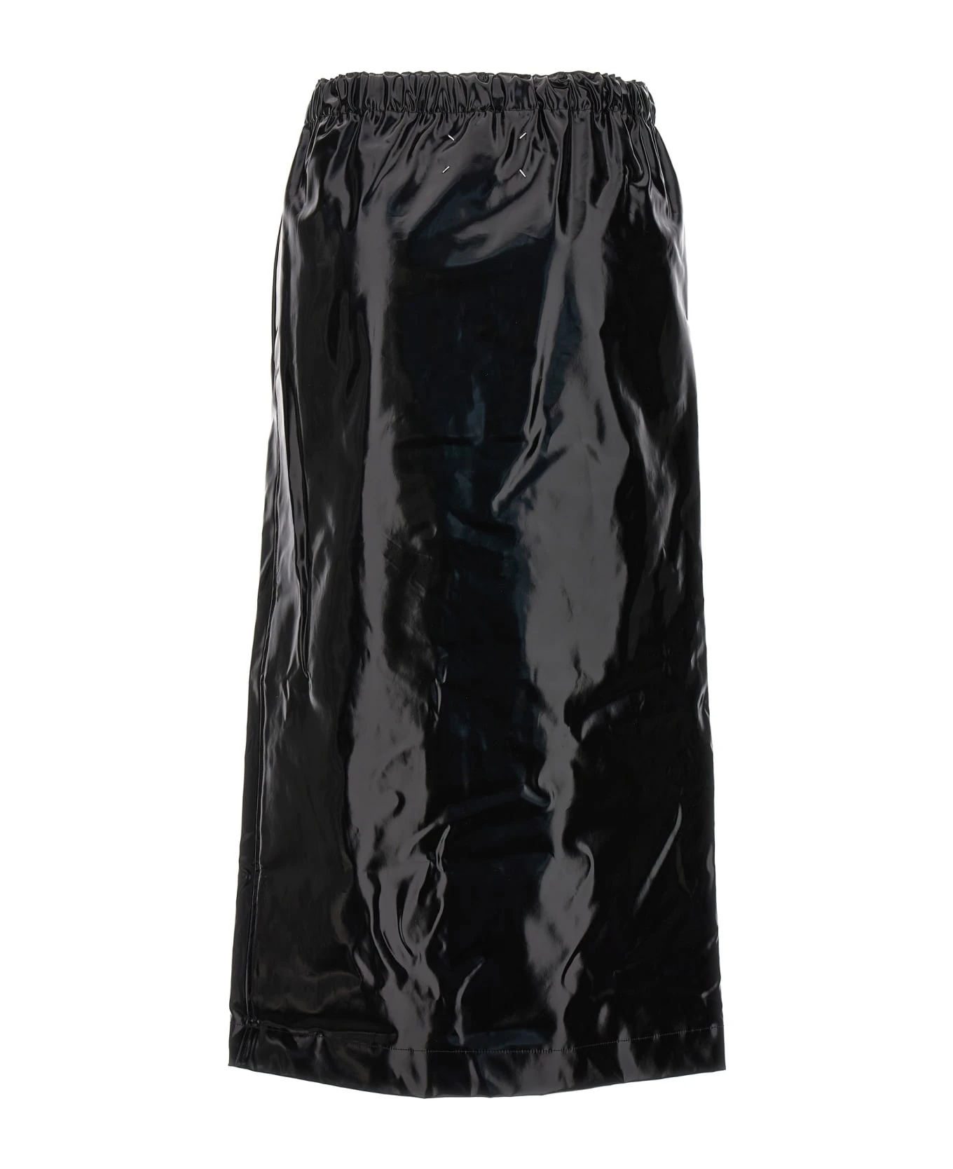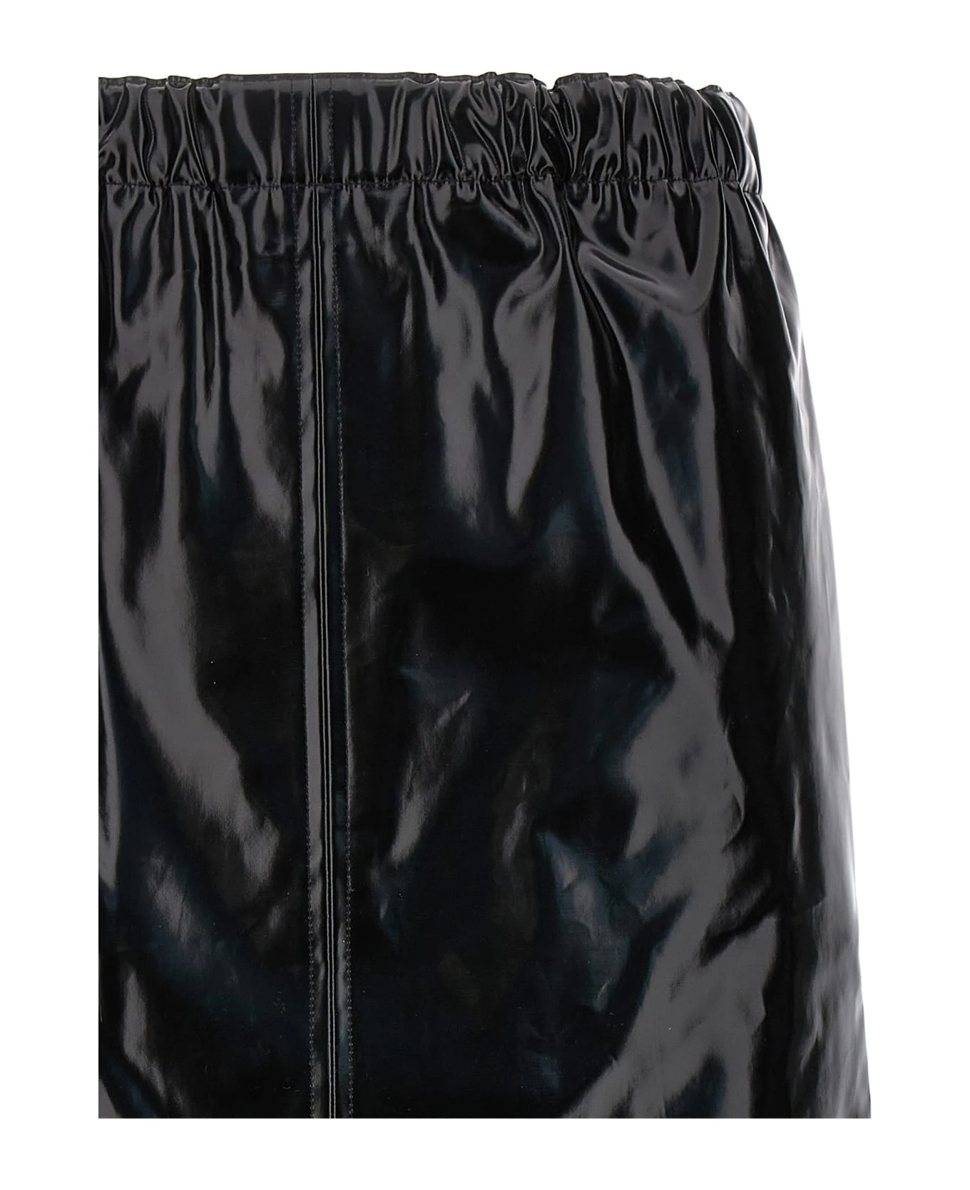 Shiny skirt in leather-effect fabric with front split, pockets, elastic waistband.