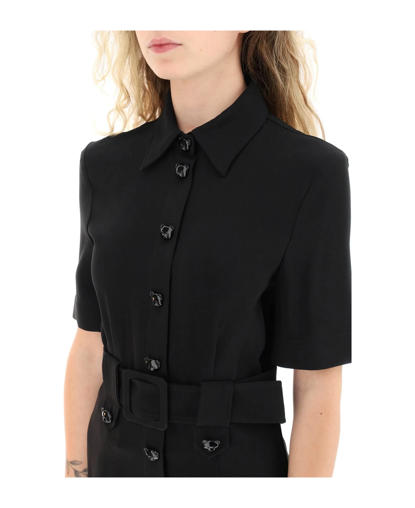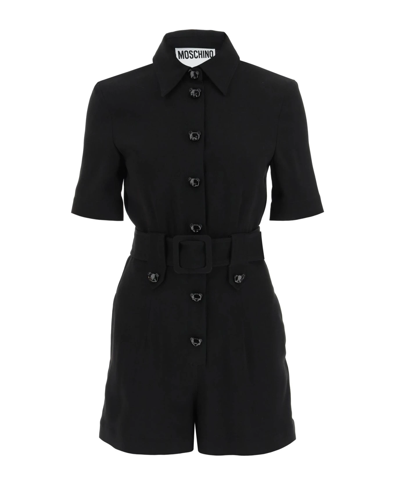 Viscose-blend crepe short jumpsuit by Moschino, featuring a full-length front closure with Teddy Bear snap buttons and Teddy Bear details on the waist loops. Provided with pointed collar, short sleeves and matching buckle belt at waist. Regular fit. The model is 177 cm tall and wears a size IT 38.