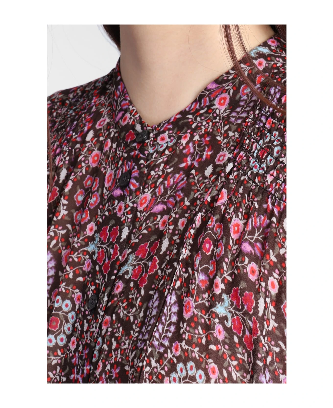 Noeline Blouse in brown viscose, long sleeves, mao collar, frontal buttoning, floral print, 100% Viscose, Made in India, Model is 1. 77 cm and wear size 38