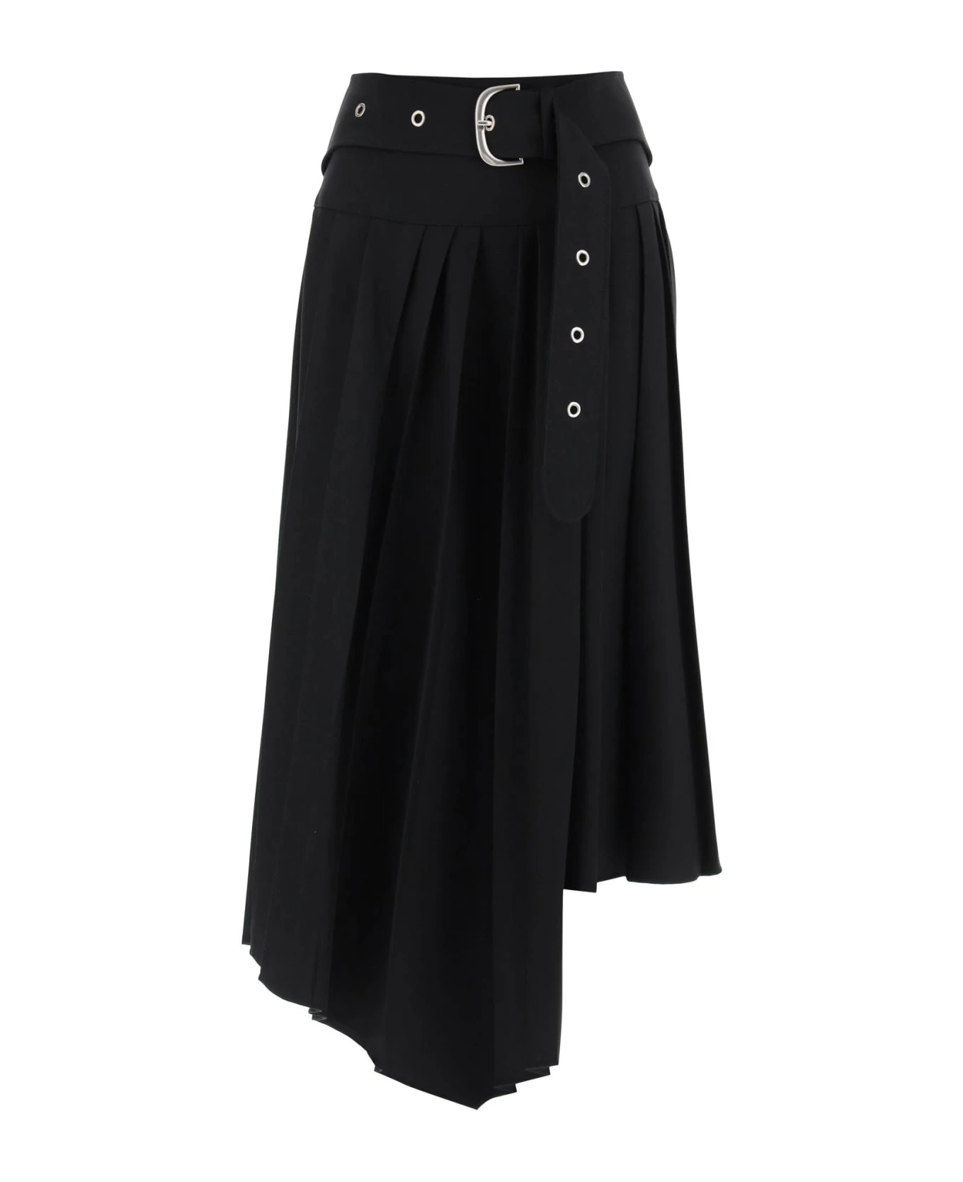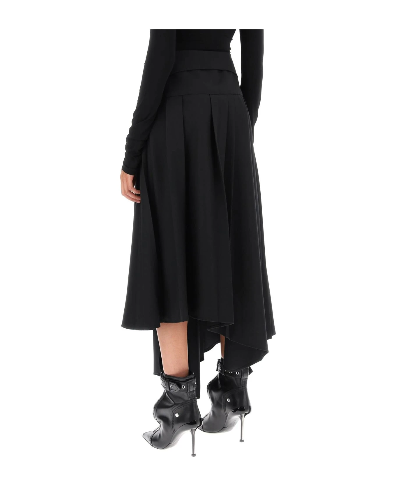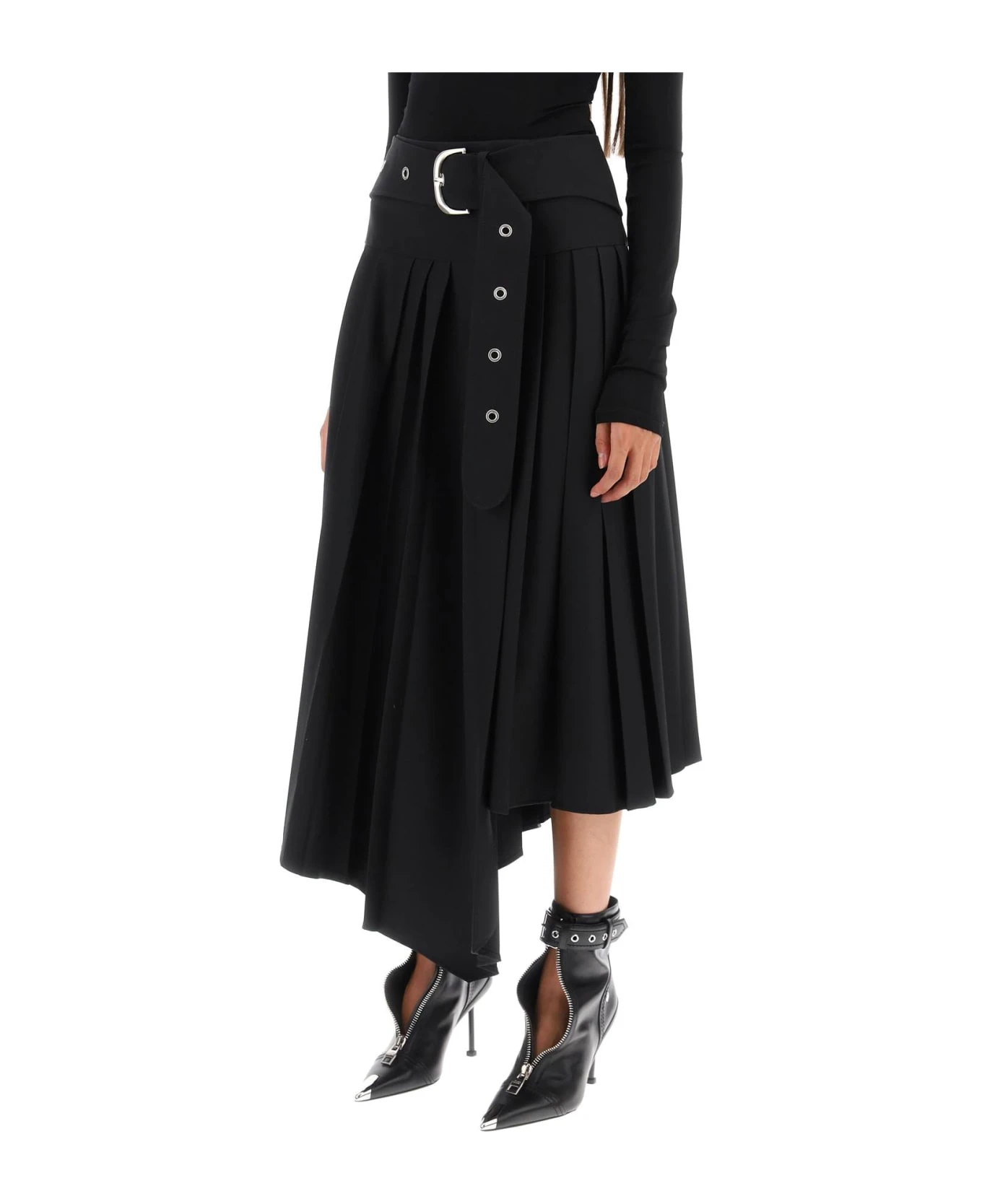 Off-White tech drill yoke skirt featuring a pleated design with asymmetric hem and integrated belt. It fastens on the front with hidden snaps. The model is 177 cm tall and wears a size IT 40.