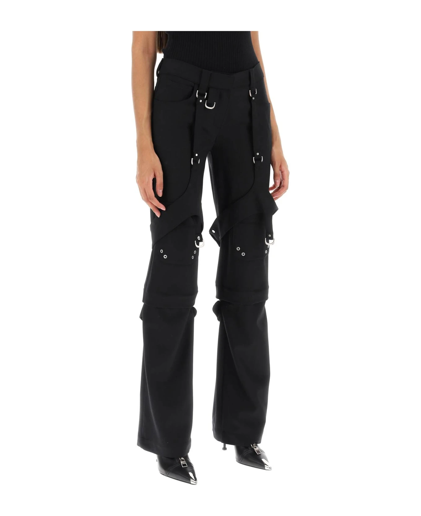 Off-White cargo pants crafted in wool blend twill with multi-pocket design. They features front fastening with zipper fly, hooks and button and belt loops on the waistband. Characterized by tonal straps and D-shaped silver-tone metal rings on legs. Slim fit with flared cut and low-rise waist. The model is 177 cm tall and wears size IT 38.