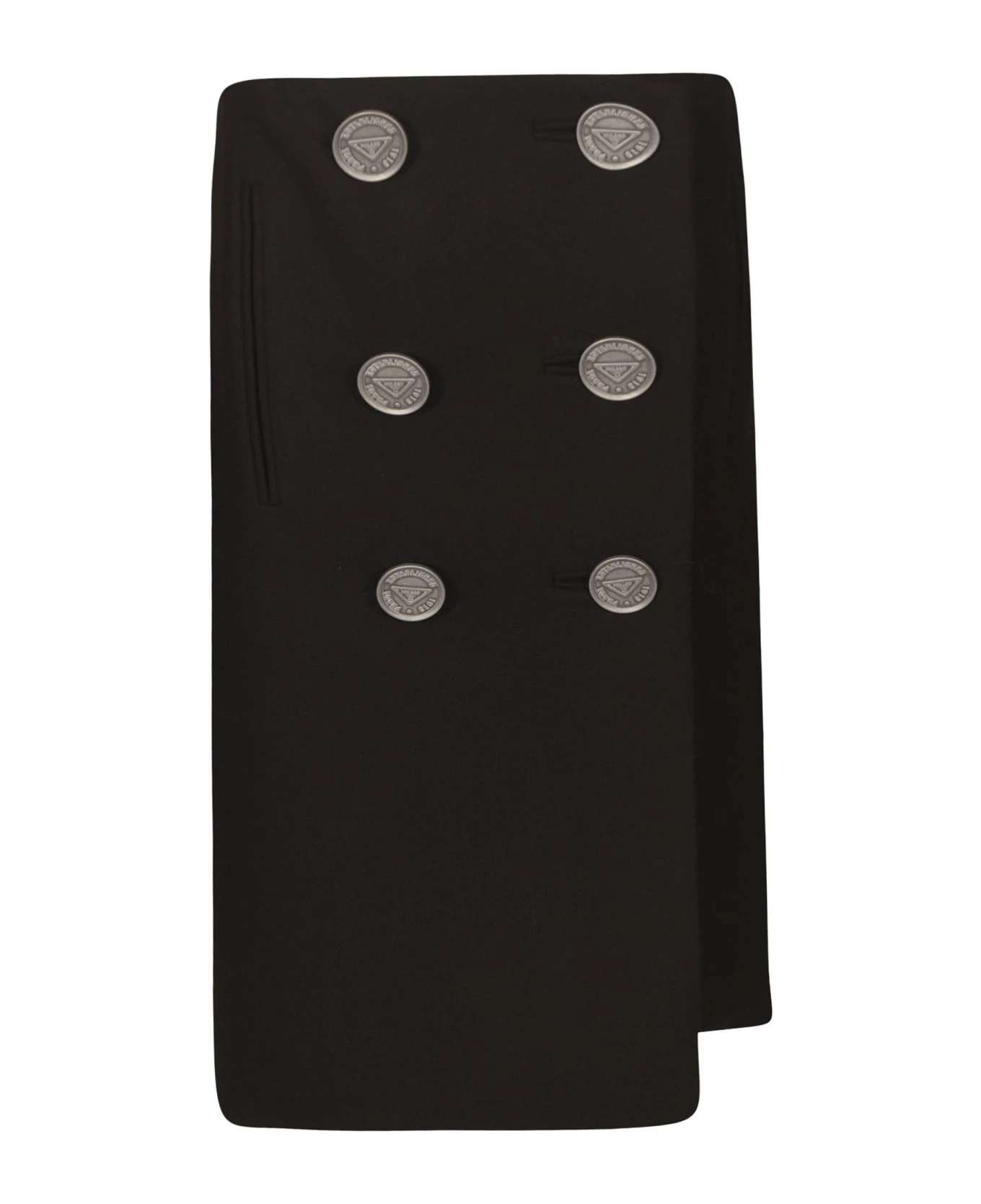 Skirt made of double wool cloth with high waist midi line. Wrap-around opening model characterized by maxi metal buttons with engraved triangular logo. Viscose lining. – Wool Skirt
