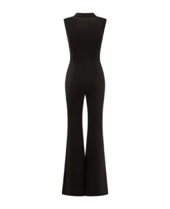 Tuxedo-style jumpsuit from Stella McCartney featuring a deep V-neckline with satin peak lapels. Crafted from pure wool suiting, it features a waisted silhouette with wide, padded shoulders and tapered trousers. It is designed with a chest pocket, press-creased legs and side seam pockets. Hidden zip fastening at the front, partial lining. The trousers are unhemmed to allow further tailoring. The model is 177 cm tall and wears a size IT 40.