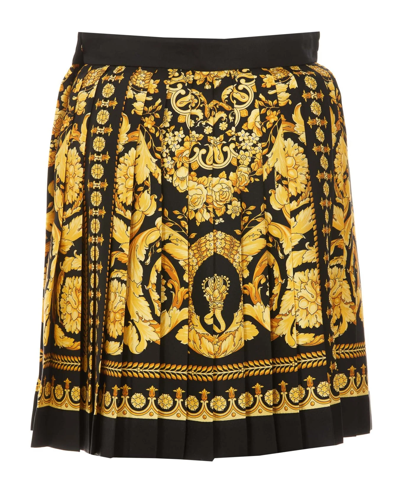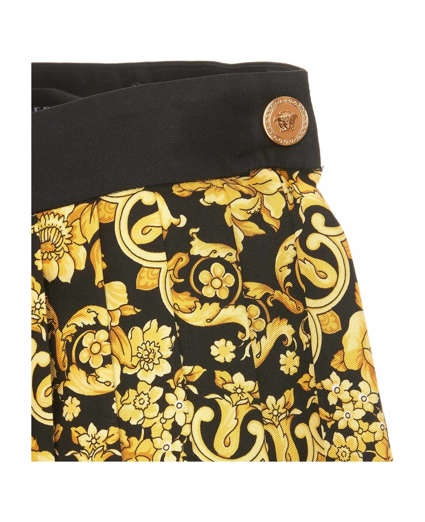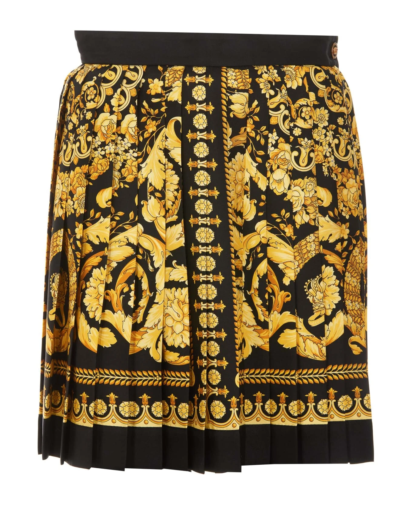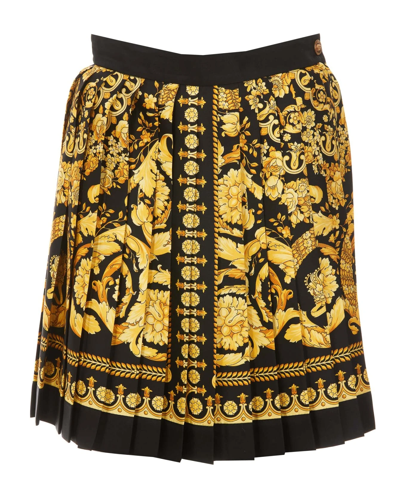 – Woman mini skirt with baroque print, lateral golden button closure and lateral zip closure