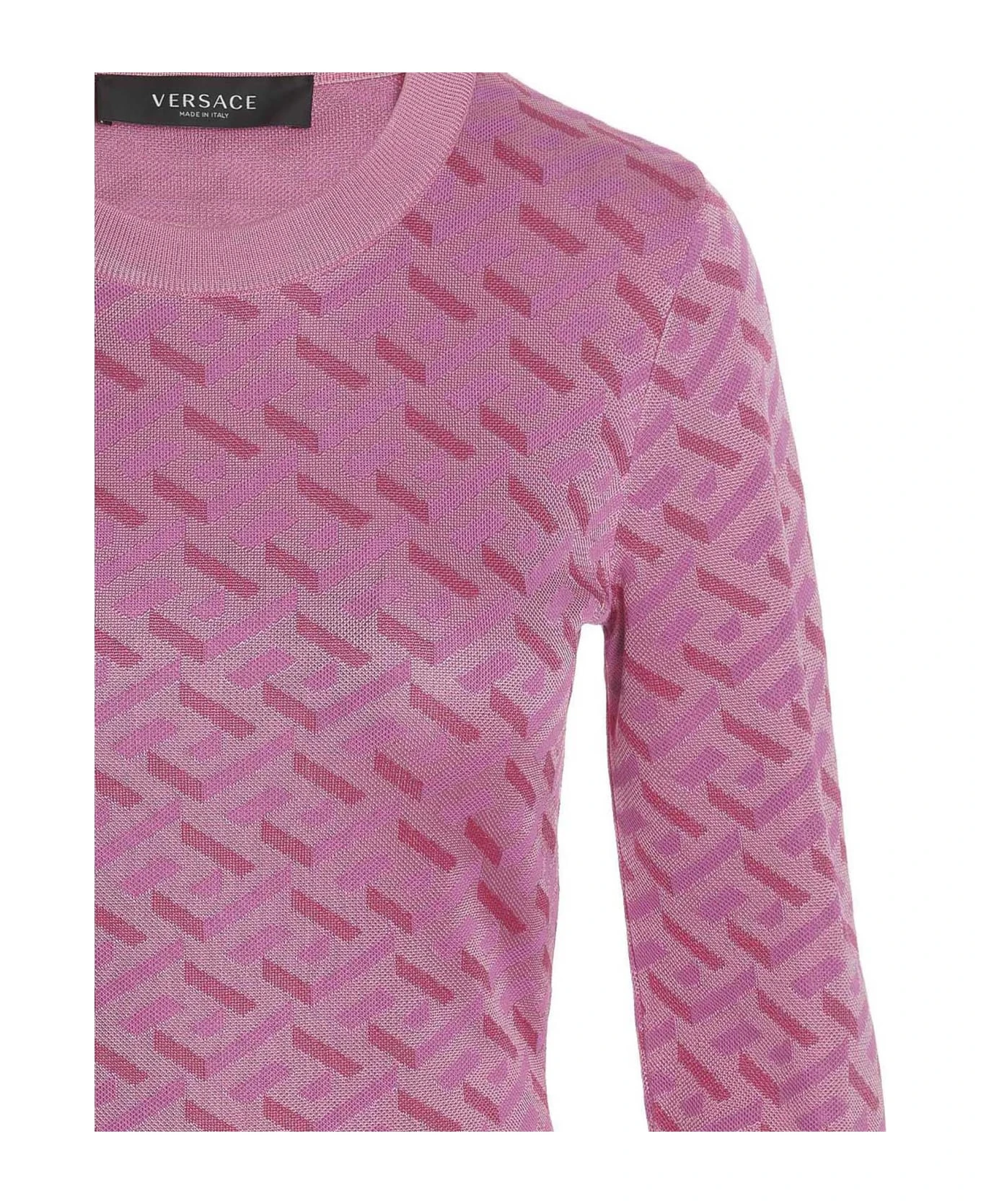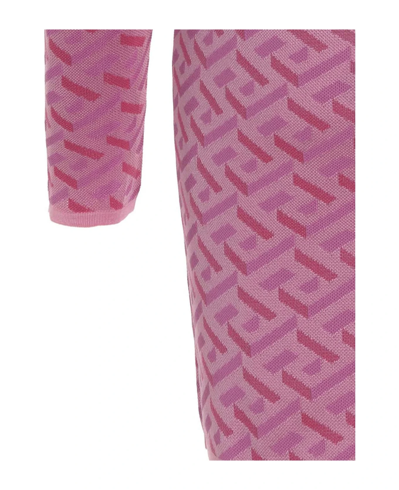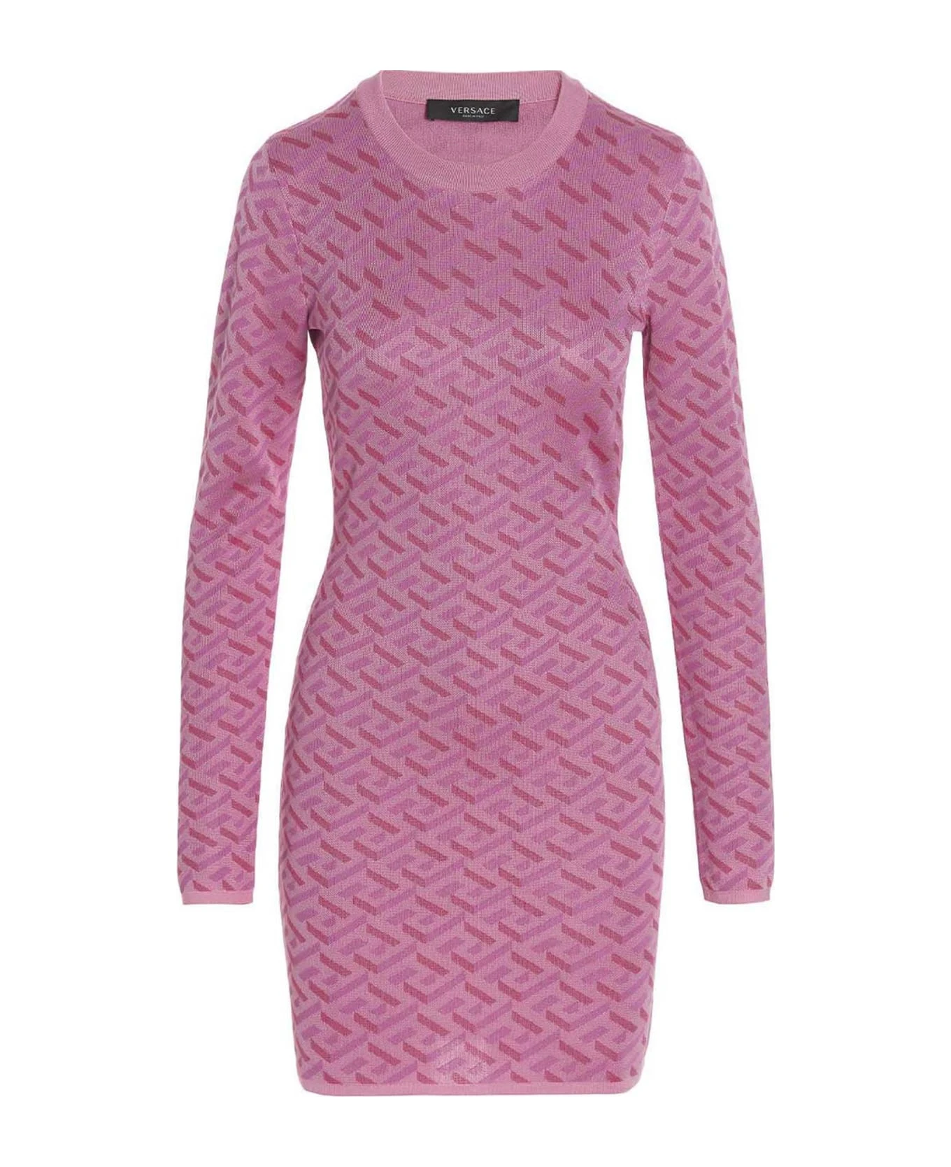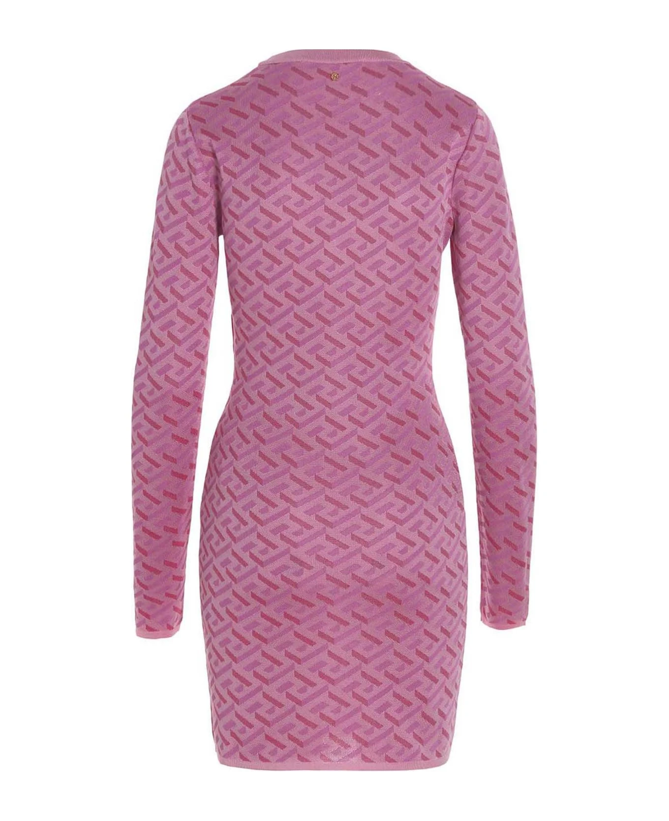 Knitted dress with all-over ‘La Greca’ pattern, crew neck, long sleeves.