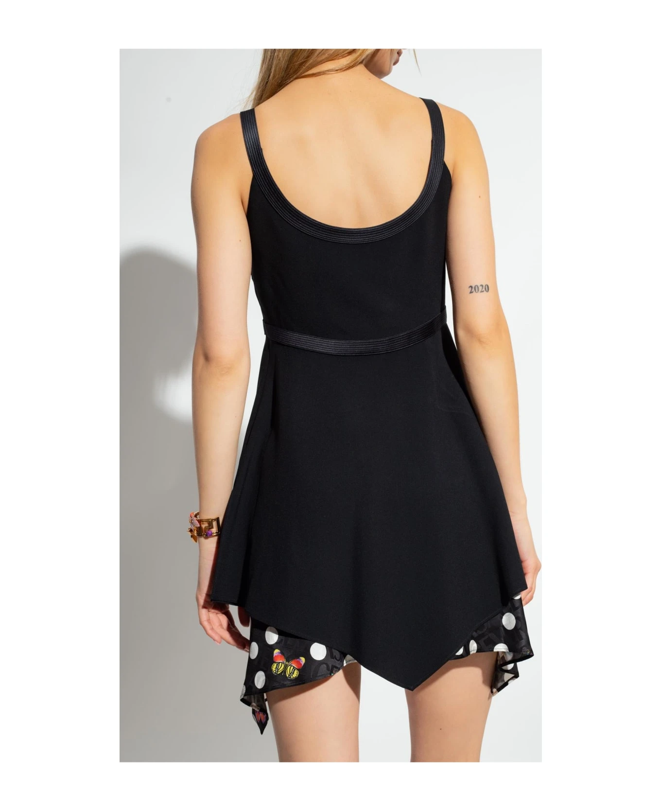 Black layered mini dress from Versace x Dua Lipa, the ‘La Vacanza’ collection. Fastened with a hidden side zipper, this style features a smooth outer layer with side slits and silk taping as well as a jacquard logo pattern and the brand’s ‘Heritage Butter
